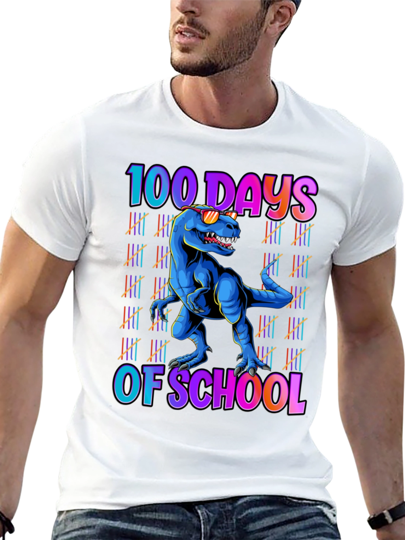 Roar into learning with this fun "100 Days of School" t-shirt! The design features a cool blue dinosaur wearing sunglasses, set against a backdrop of colorful tally marks and playful lettering. Perfect for celebrating a milestone in the school year, this tee is sure to be a hit with kids and teachers alike. The black fabric makes the vibrant graphic pop, while the classic crew neck and short sleeves provide a comfortable fit for all-day wear. Show off your school spirit with this unique and eye-catching shirt!