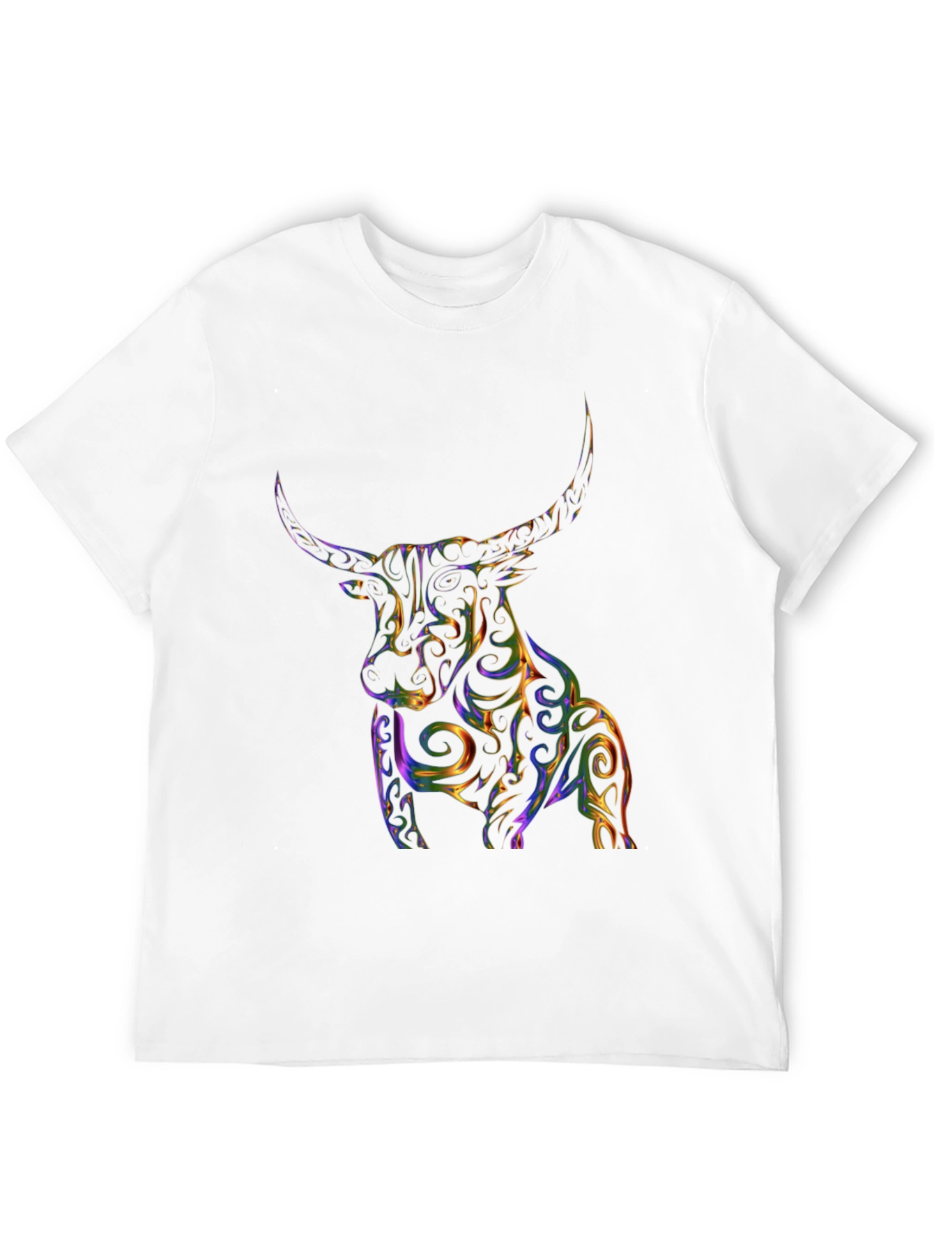 Make a statement with this striking black t-shirt featuring an intricate, abstract bull design. The bull is rendered in vibrant, swirling colors creating a captivating visual effect. The tee is made from what appears to be a soft and comfortable cotton blend, perfect for everyday wear. This unique tee is sure to turn heads. Wear it casually with jeans, or dress it up for a night out. This tee makes a great conversation starter and showcases your individual style. It's an ideal gift for animal lovers and anyone who appreciates distinctive artistic apparel.