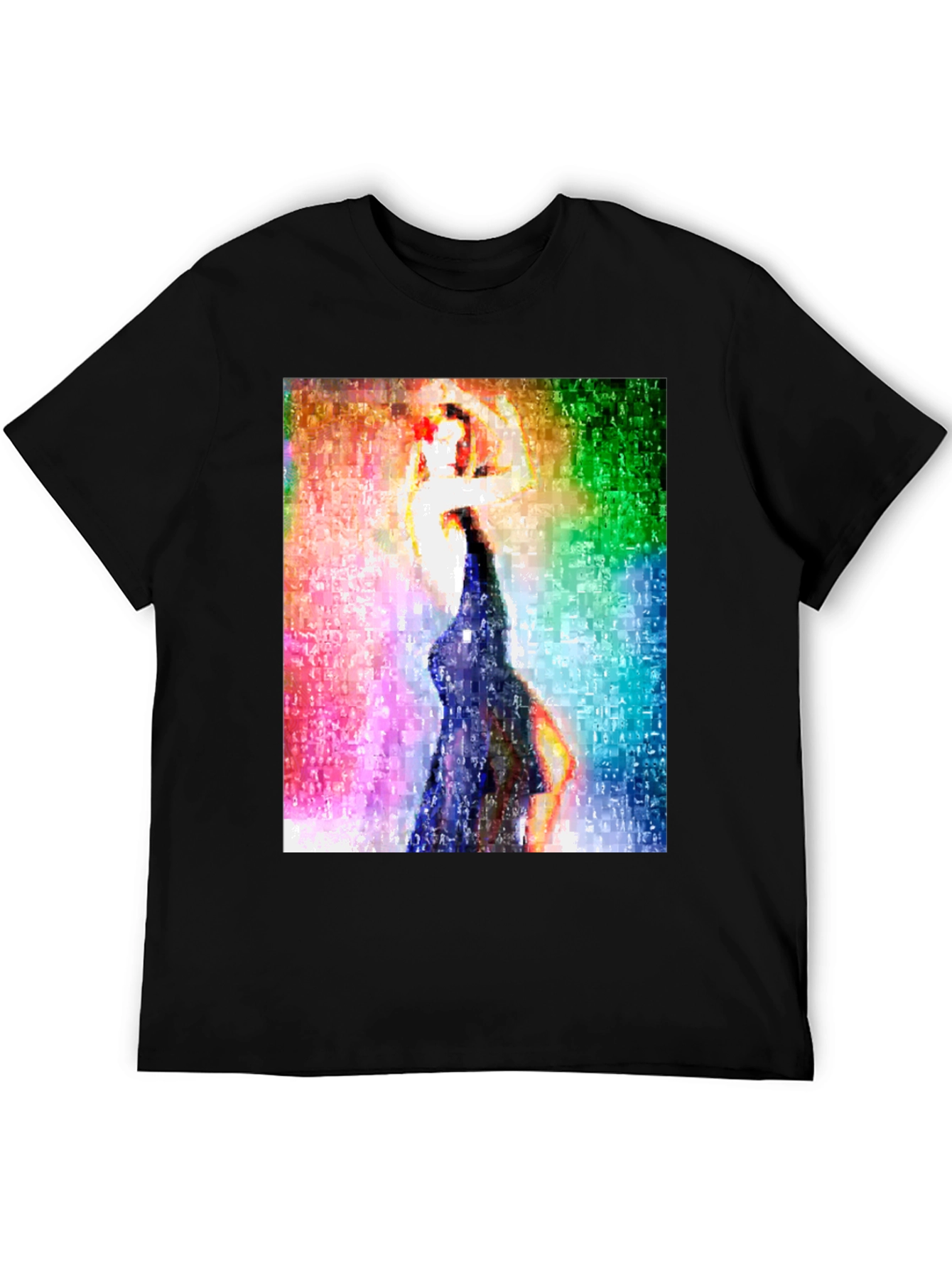 Make a statement with this striking black t-shirt featuring a vibrant, abstract graphic. The design showcases a woman in a flowing dress, depicted in a mosaic-style, creating a stunning visual effect. The colorful background enhances the figure, making it a unique piece. Made from a comfortable, breathable fabric, this tee is perfect for casual outings, parties, or making a bold fashion statement. Pair it with jeans or shorts for a trendy, standout look. Express your unique style and add an artistic edge to your wardrobe with this eye-catching tee!