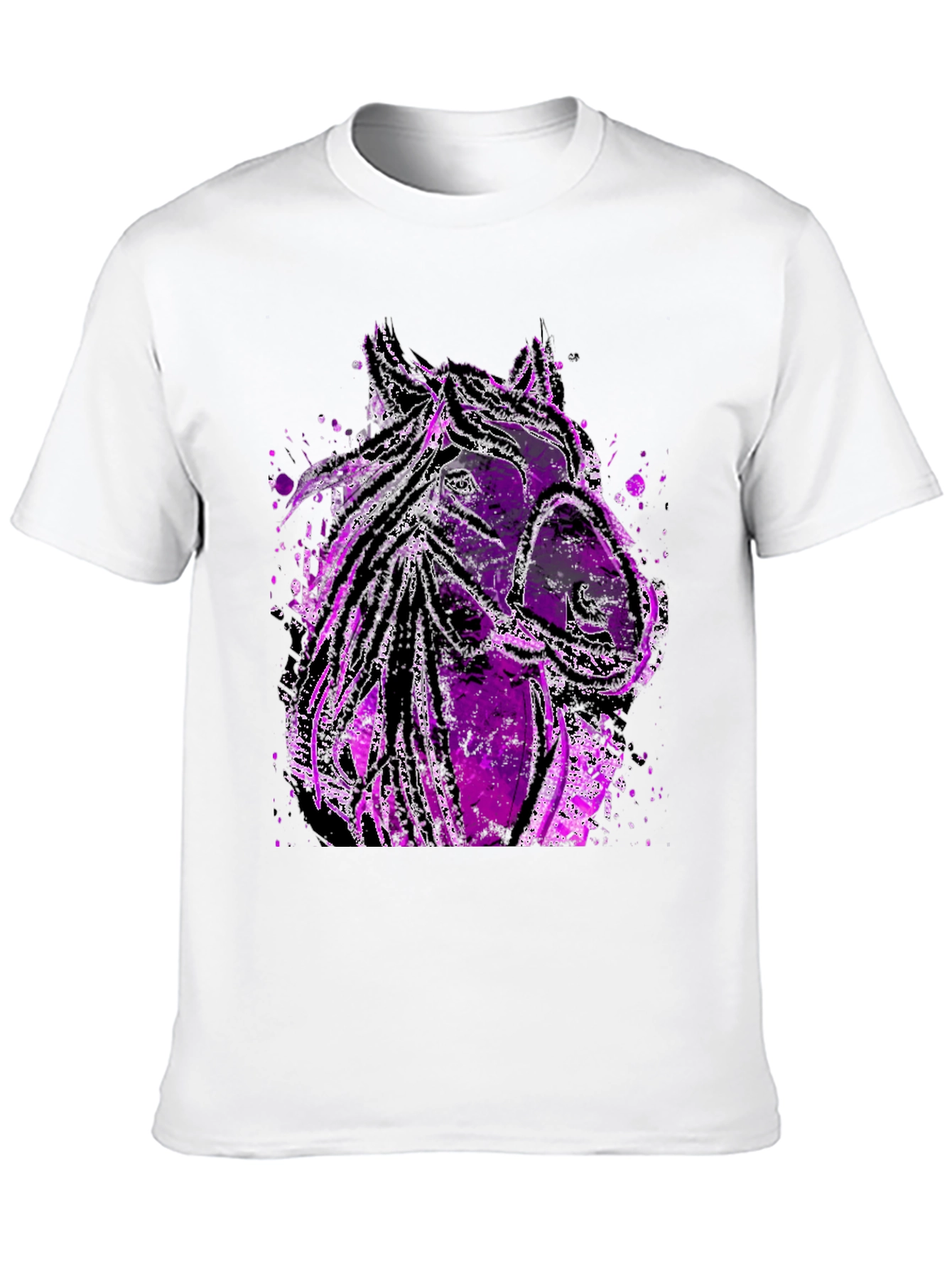 Make a statement with this unique black t-shirt featuring an eye-catching, abstract horse graphic. The design showcases a stylized horse head in shades of purple and black, with paint splatter effects adding an artistic touch. Made from a comfortable, soft fabric, this tee is perfect for casual wear. The bold print ensures you'll stand out from the crowd. Ideal for horse lovers and art enthusiasts alike, this t-shirt is a versatile addition to any wardrobe. Pair it with jeans or shorts for a relaxed, stylish look. Express your individuality with this distinctive tee!