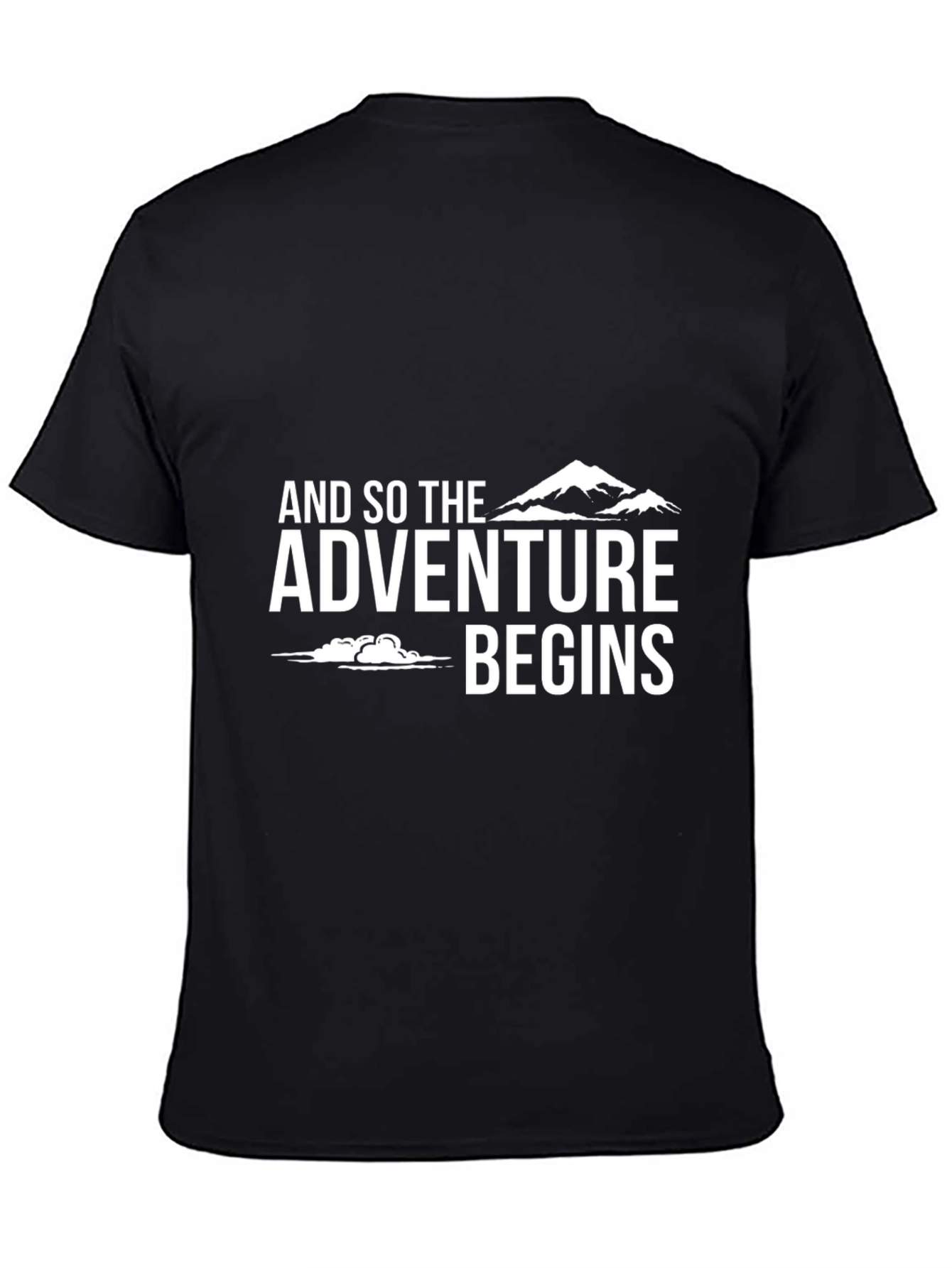 Embark on your next adventure with this stylish and motivational graphic t-shirt. The shirt features a bold "AND SO THE ADVENTURE BEGINS" print, accompanied by a stylized mountain range and cloud graphic, symbolizing the start of an exciting journey. Made from a comfortable, soft black fabric, this tee is perfect for everyday wear or your next outdoor excursion. Pair it with jeans, shorts, or your favorite hiking gear for a casual yet inspiring look. The design is printed in a crisp white, creating a striking contrast against the black background. This t-shirt is not just apparel; it's a statement of your adventurous spirit.