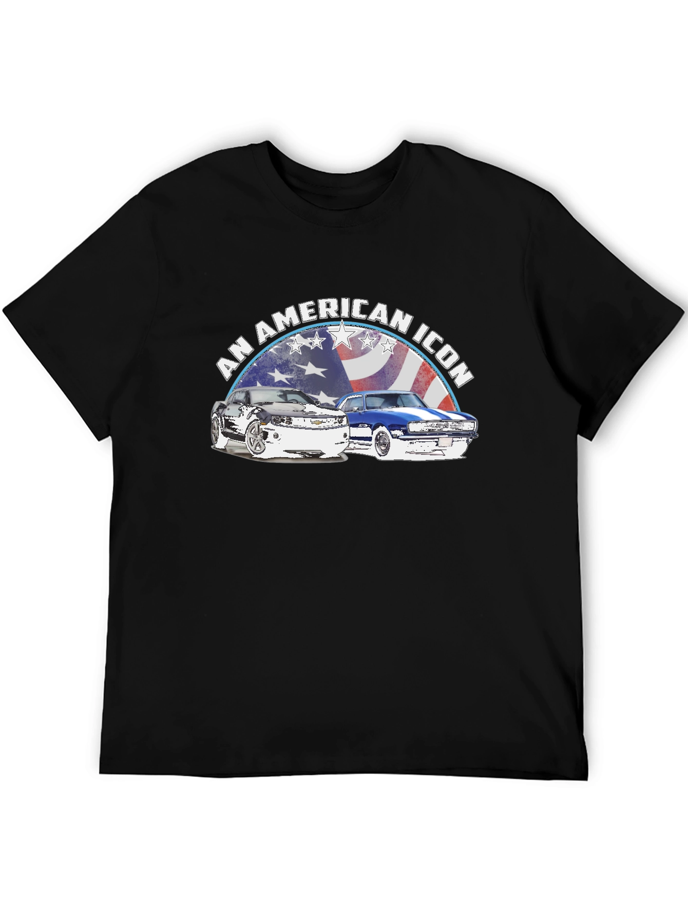 Show your love for classic American muscle with this eye-catching black t-shirt. The bold graphic features two iconic cars set against a vintage American flag backdrop, framed by the words "An American Icon." Made from a comfortable, breathable fabric, this tee is perfect for everyday wear, car shows, or casual outings. The detailed print and classic fit make it a standout piece for any automotive enthusiast's wardrobe. A great way to express your passion for American muscle cars and the open road. Get yours today and wear your icon!