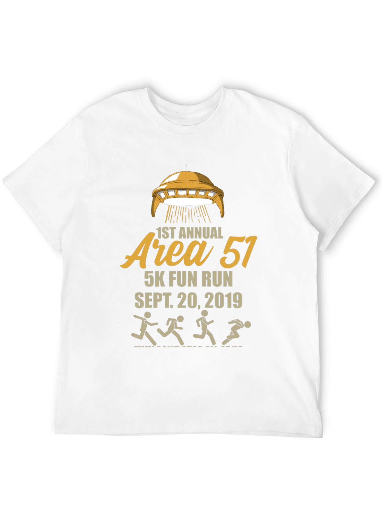 This black t-shirt features a novelty design commemorating the '1st Annual Area 51 5K Fun Run' held on Sept. 20, 2019. Above the text is an illustration of a UFO, and below are minimalist figures depicting runners in motion. The design is printed in a muted yellow color scheme. Made from what appears to be a soft and breathable cotton blend, this tee offers both comfort and style. It's perfect for casual wear, running errands, or showing off your unique sense of humor at social gatherings. Makes a great gift for UFO enthusiasts or runners who appreciate a fun, memorable event.