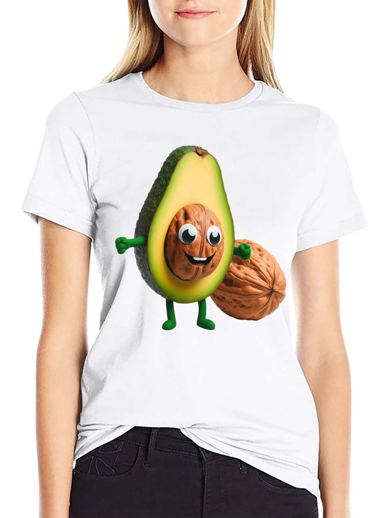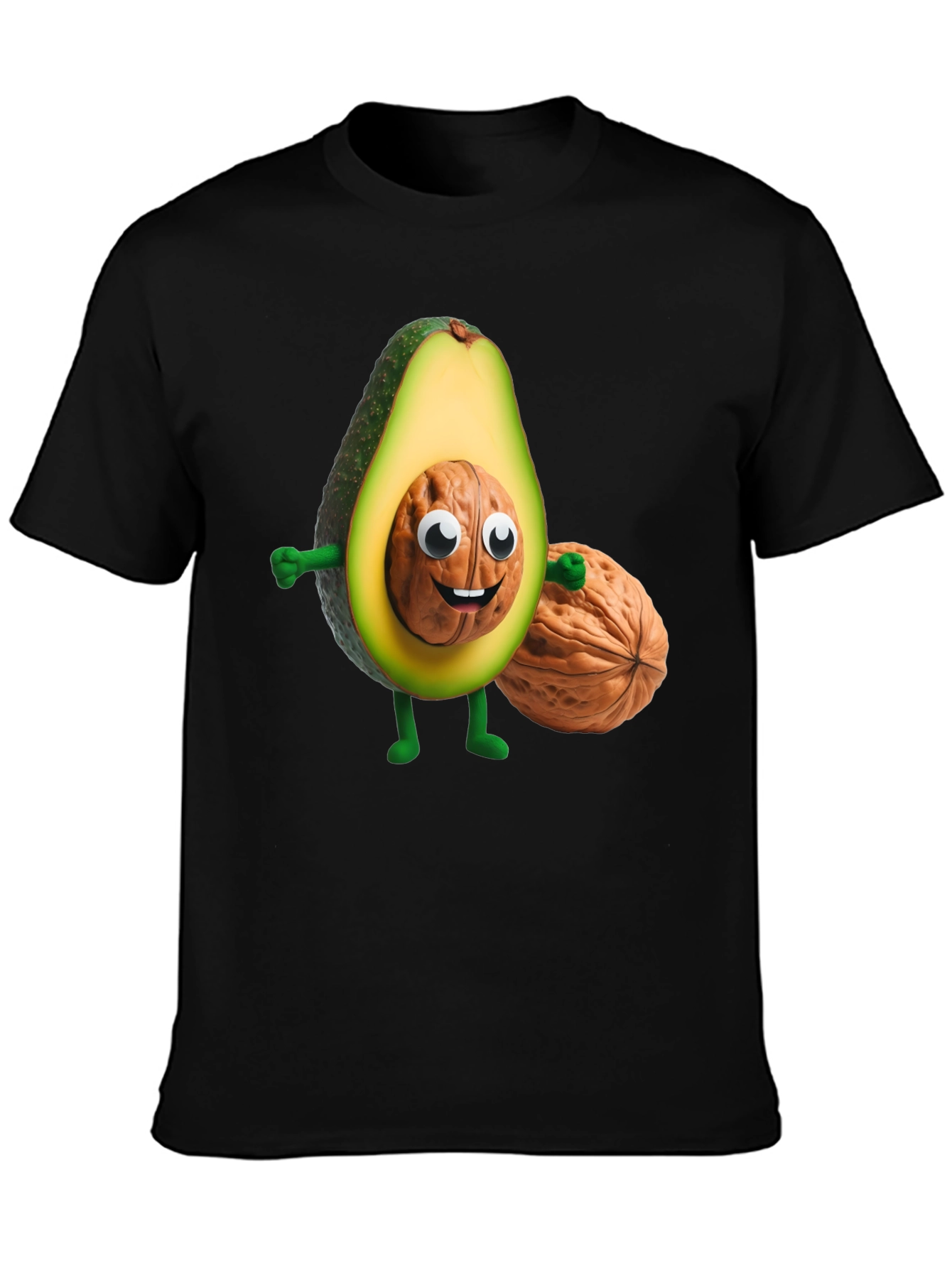 This black t-shirt features a playful and eye-catching graphic print. The design showcases an avocado character with a walnut replacing the pit, complete with a smiling face and limbs. A whole walnut sits beside it. The shirt is made from a comfortable-looking fabric, perfect for casual wear. Ideal for those who love quirky, fun designs or have a passion for healthy eating. Show off your unique style with this conversation-starting tee. Makes a great gift for avocado and nut enthusiasts!