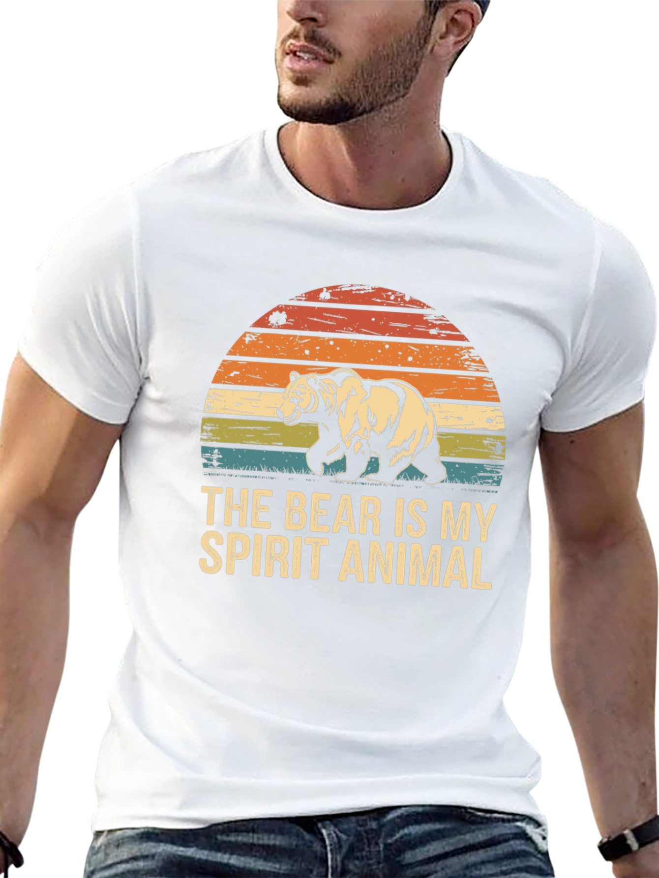 Embrace your inner wild with this unique graphic tee! Featuring a bold illustration of a bear set against a retro-style sunset, this shirt is sure to turn heads. The design includes the statement "The Bear Is My Spirit Animal", perfect for nature lovers. Made from a soft and comfortable material, this black tee offers both style and ease. Ideal for casual wear, outdoor adventures, or as a statement piece, this shirt is perfect for expressing your personality. Show off your love for nature with this eye-catching and comfortable tee!