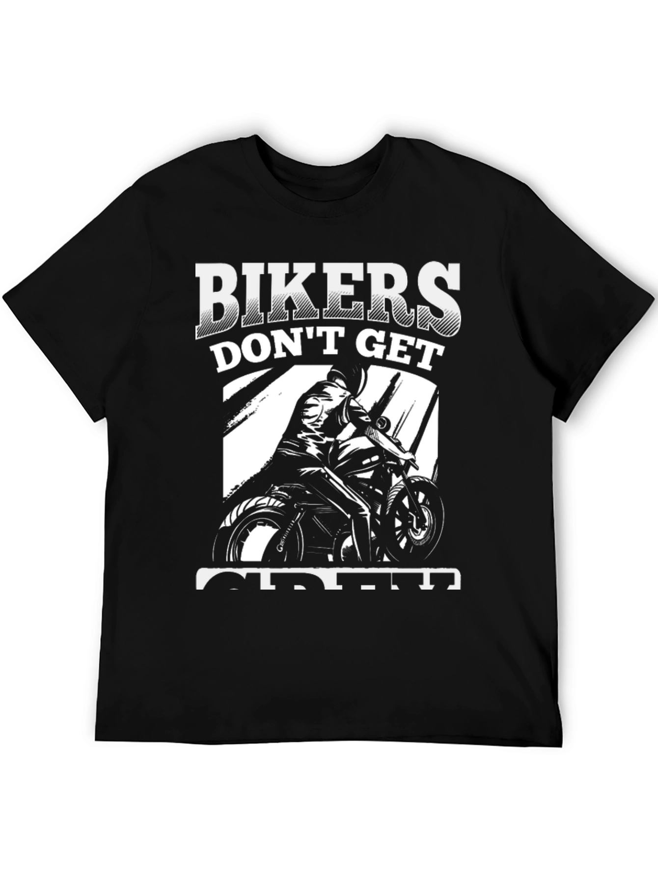 Showcase your love for riding with this stylish black t-shirt! Featuring a bold graphic print that reads "Bikers Don't Get Older," it displays a detailed illustration of a biker on a motorcycle. The design is prominently placed on the front, making it a great conversation starter. Made from comfortable fabric, this tee is perfect for casual wear, bike meets, or simply expressing your passion for motorcycles. Get yours today and ride in style!