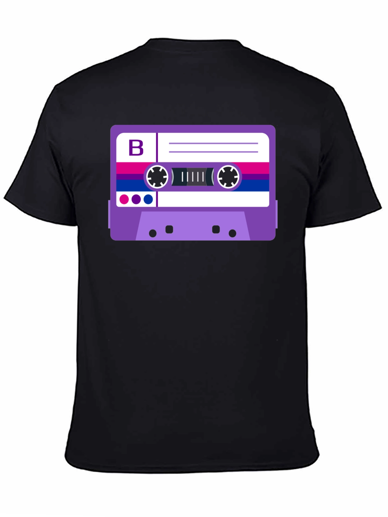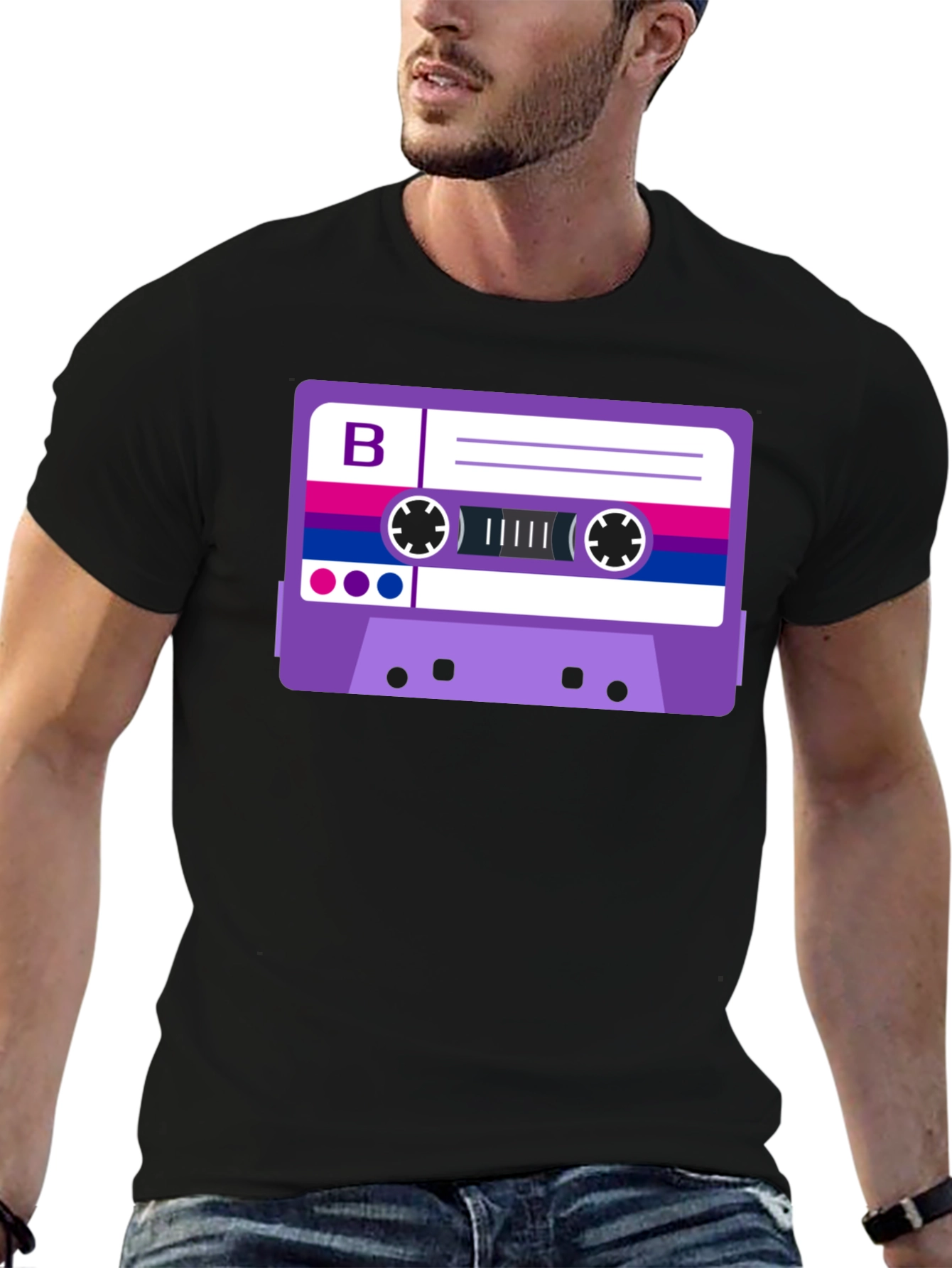 Show your pride with this eye-catching t-shirt featuring a retro cassette tape design in the colors of the bisexual flag. The striking graphic is prominently displayed on a classic black tee, making it a bold statement piece. Made from comfortable, breathable fabric, this shirt is perfect for everyday wear, pride events, or simply expressing yourself. The design incorporates purple, blue, and pink hues in a creative and nostalgic way. Add this unique and meaningful shirt to your wardrobe and let your true colors shine!