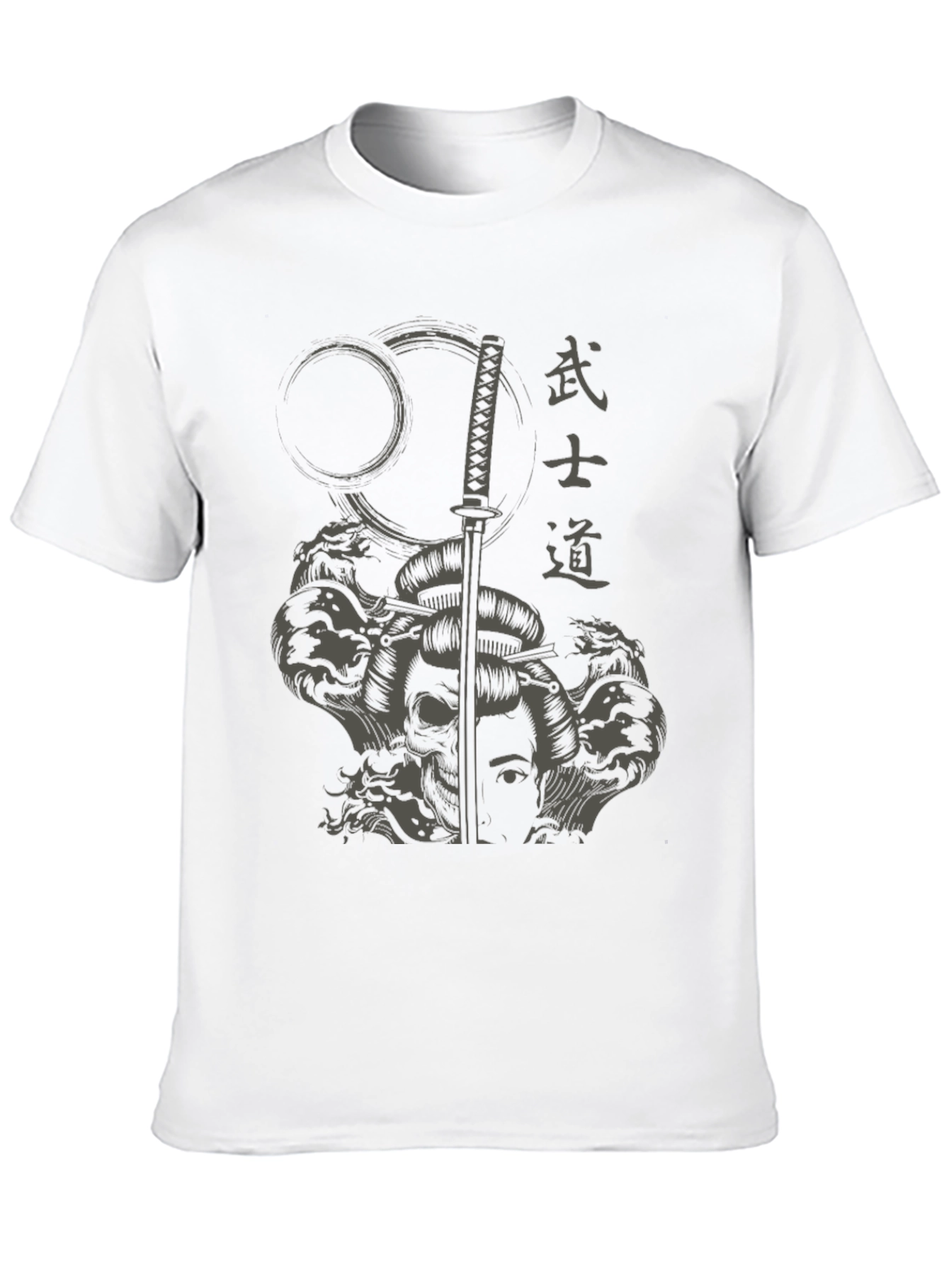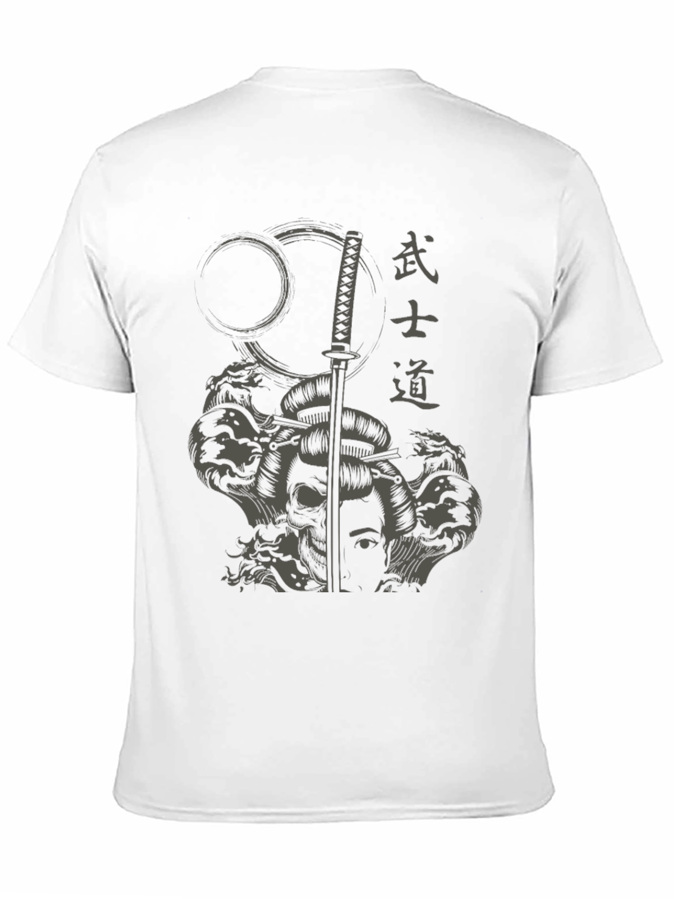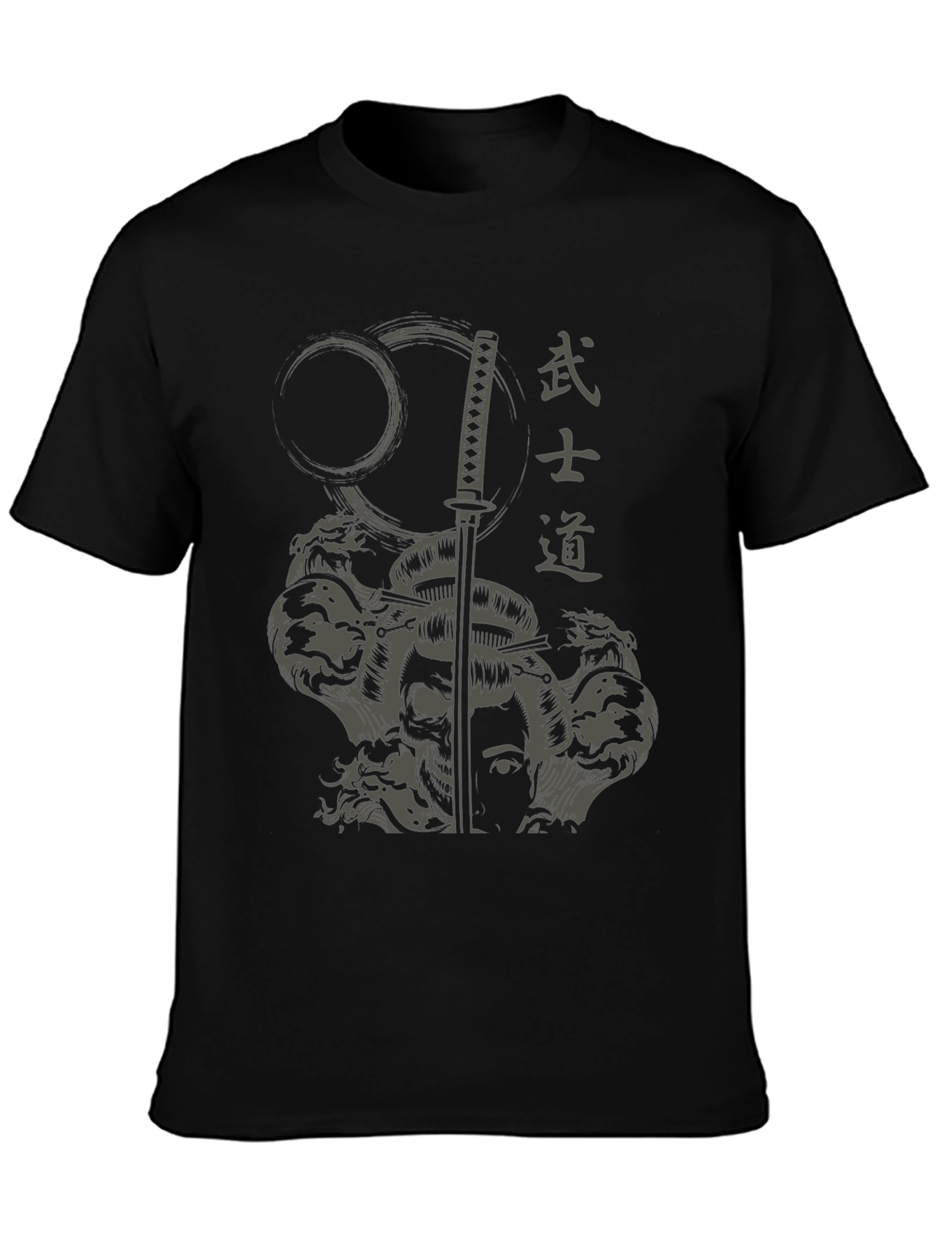 Embrace the warrior spirit with this striking black t-shirt. Featuring a bold graphic print, it showcases a stylized samurai design with a katana, encircled by a moon symbol, and traditional Japanese characters. The intricate artwork adds an air of mystique and strength. Crafted from a comfortable, breathable fabric, this tee offers a relaxed fit perfect for everyday wear. Whether you're a fan of martial arts, Japanese culture, or simply appreciate unique designs, this shirt is a must-have addition to your wardrobe. Show off your individual style with this cool and eye-catching tee.