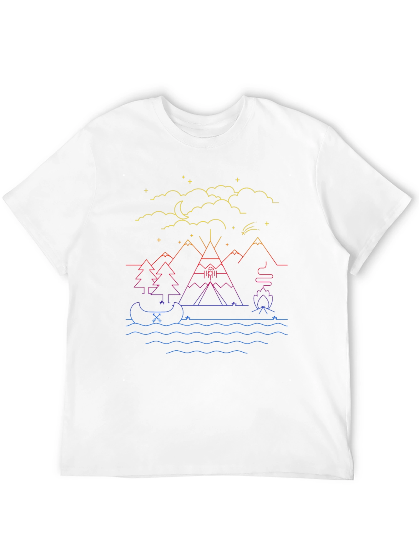 Embrace your love for the outdoors with this unique graphic tee. Featuring a stylized, colorful line art design, the shirt showcases a serene camping scene with a teepee, mountains, trees, and a canoe on a lake under a starlit sky. The vibrant gradient from yellow to blue adds a modern touch to the classic outdoor theme. Made from a comfortable, breathable fabric, this black t-shirt is perfect for casual wear, outdoor adventures, or as a thoughtful gift for nature enthusiasts. Stand out with this artistic tee and let your passion for camping shine.