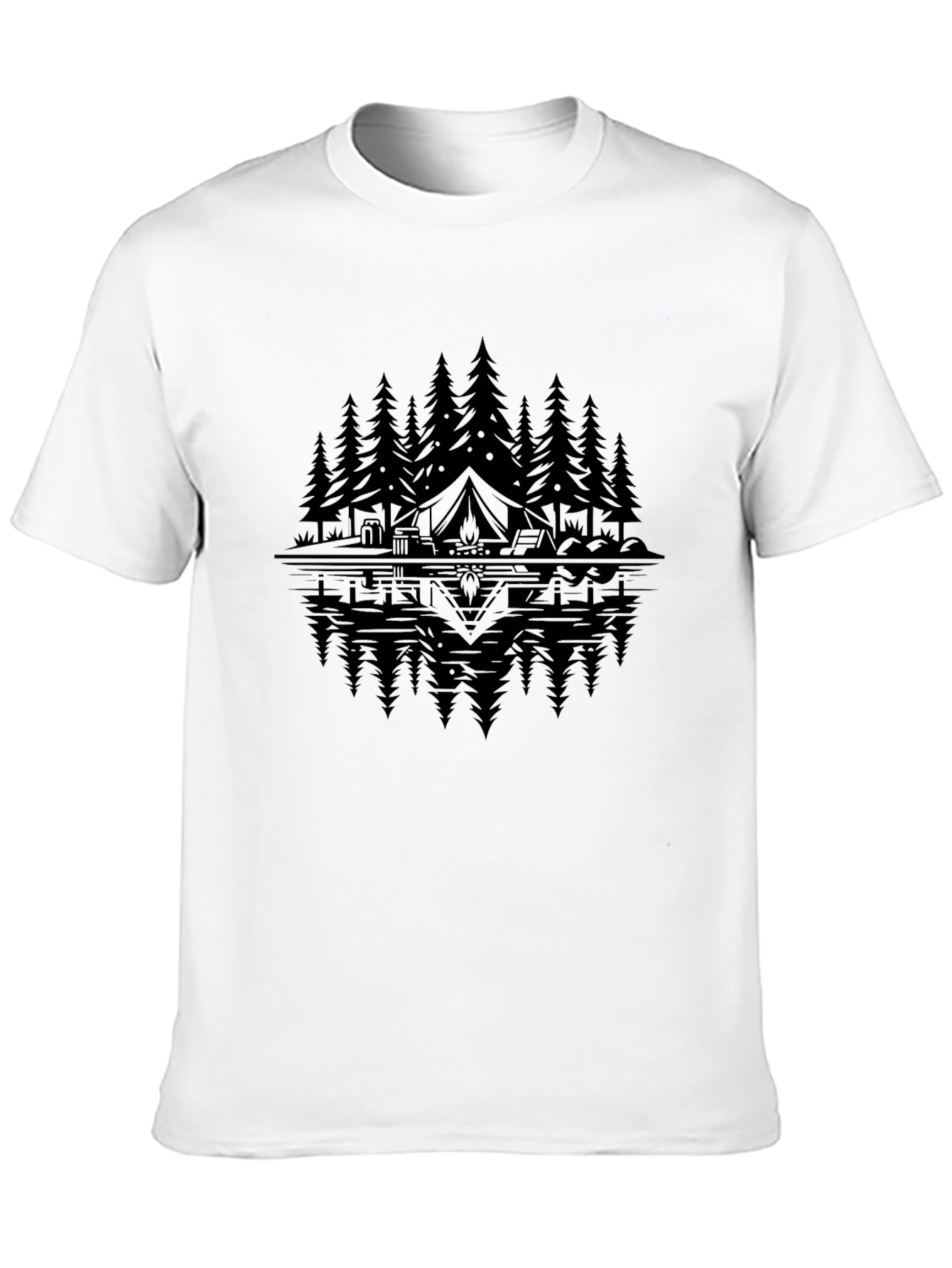 Embrace the spirit of adventure with this stylish black t-shirt. The shirt features a unique graphic design of a campsite nestled among tall pines, beautifully mirrored to create a tranquil, reflective image. Ideal for outdoor enthusiasts, this tee is not only visually appealing but also offers a comfortable fit for any casual occasion. Perfect for everyday wear, camping trips, or as a gift for the nature lover in your life. Show off your passion for the great outdoors with this stand-out t-shirt!