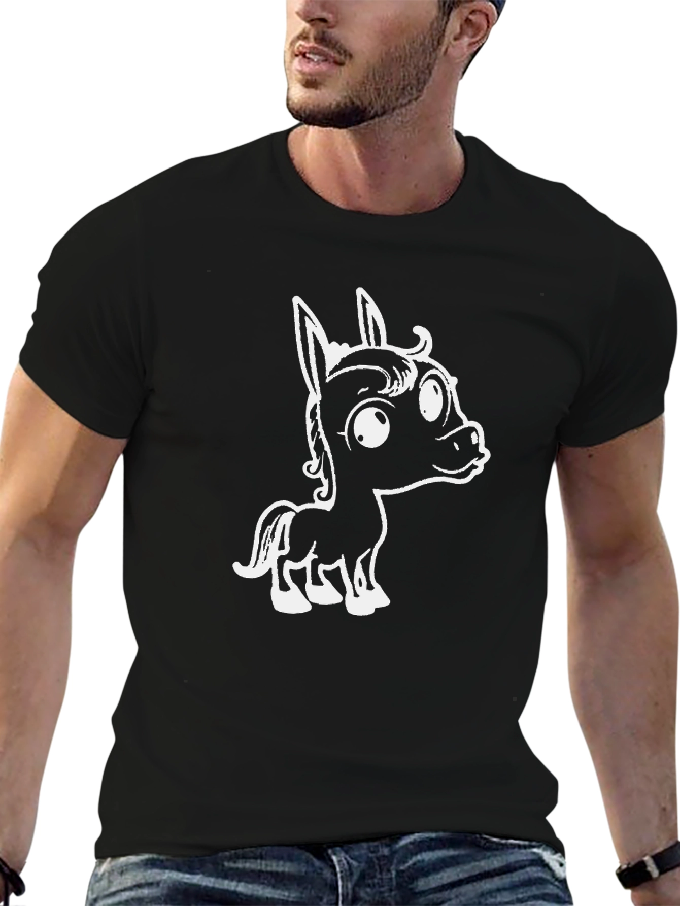 Show off your playful side with this black graphic tee. Featuring a cute, cartoon-style white horse design, this shirt is perfect for casual wear. Made from a soft, comfortable fabric, it offers a relaxed fit for all-day comfort. The bold contrast of the white graphic against the black backdrop ensures the design pops. Ideal for animal lovers or anyone who enjoys whimsical fashion, this tee adds a touch of fun to any outfit. Pair it with jeans or shorts for an easy, stylish look. A must-have addition to your wardrobe!