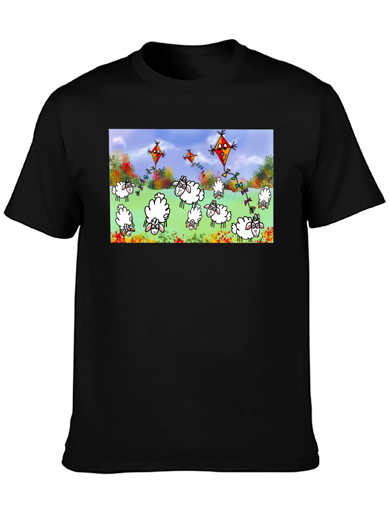 Elevate your casual style with this unique black tee! This short-sleeve shirt features a playful cartoon design with fluffy sheep and colorful kites, perfect for adding a touch of whimsy to your wardrobe. Crafted from comfortable fabric, this tee offers a relaxed fit for everyday wear. The print showcases a vibrant scene with sheep frolicking under kites, set against a soft background. Ideal for casual outings, weekend activities, or just lounging at home, this tee is a fun and stylish choice. Add a bit of cheer to your day!