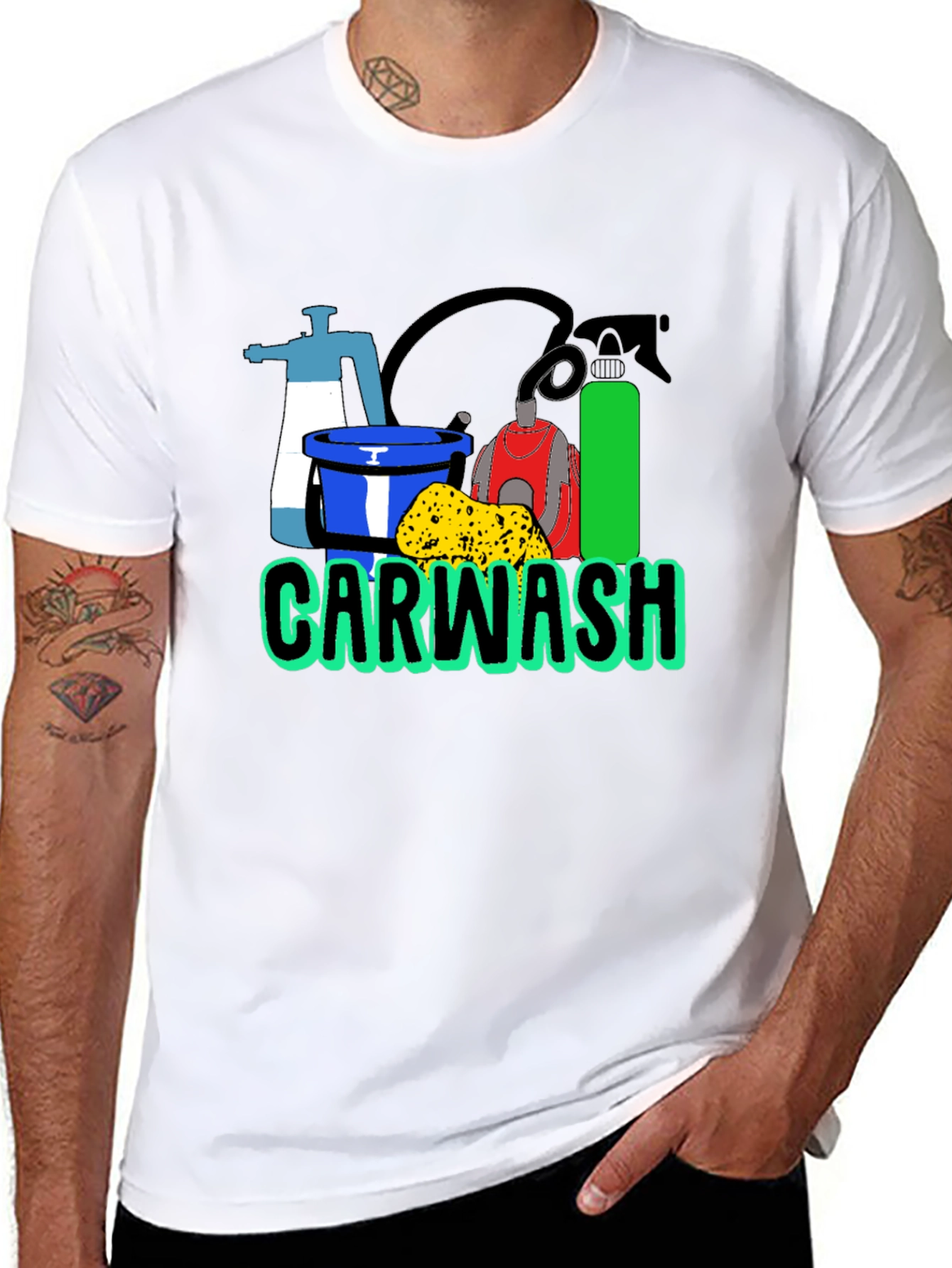 Show off your love for a clean car with this black graphic tee. Featuring a carwash design with cleaning supplies and "CARWASH" text, this tee is perfect for car enthusiasts, carwash employees, or anyone who likes a clean vehicle. The design has a bucket, sponge, and car soap sprayers. Made from comfortable materials, it's ideal for casual wear. Machine washable for easy care. Grab this tee and show your passion!