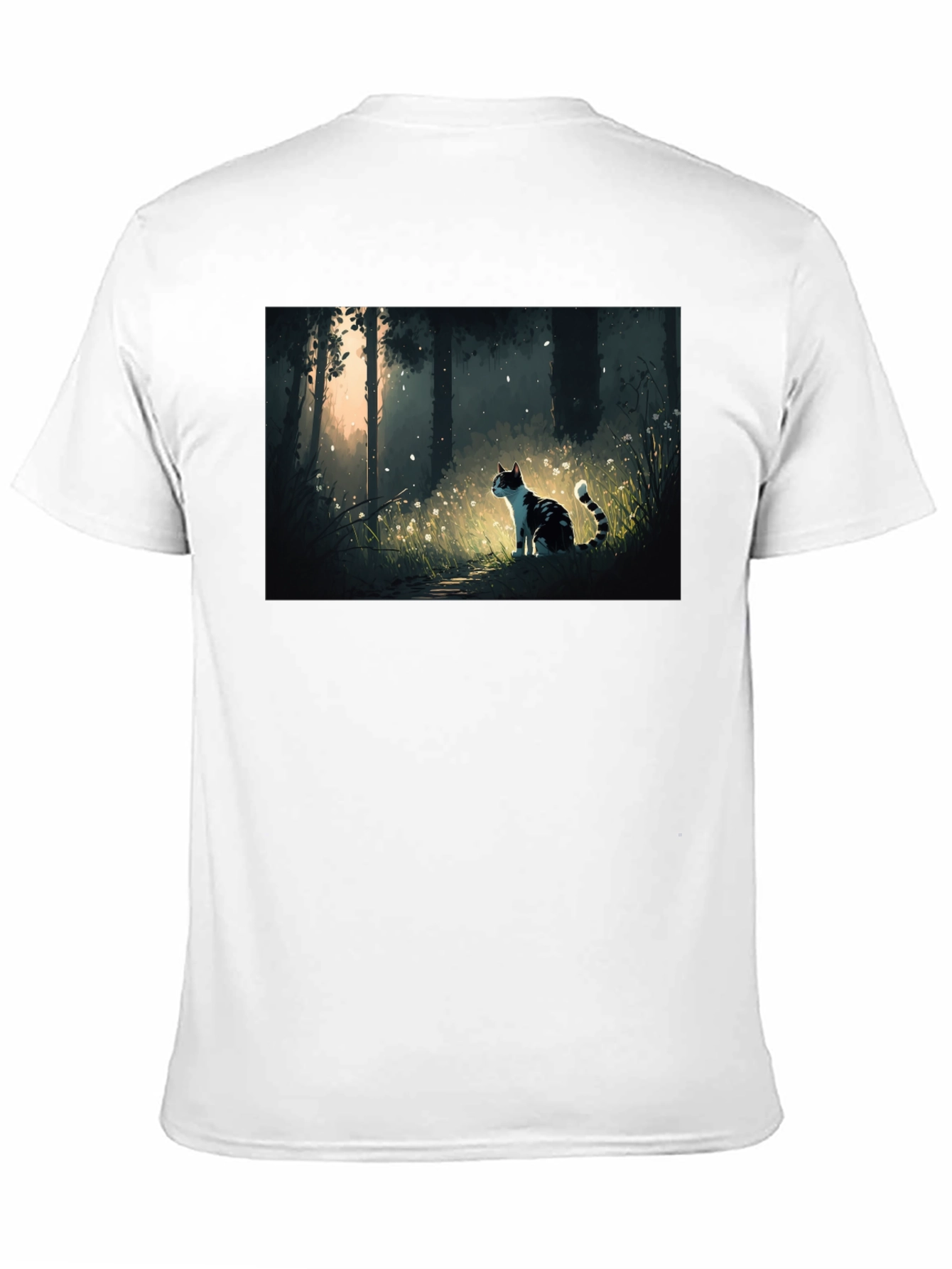 This striking black t-shirt features a captivating image of a black and white cat sitting peacefully in a forest clearing. The design showcases a picturesque scene with light filtering through the trees. Made from comfortable, breathable fabric, this tee is perfect for everyday wear. The print is high-quality and durable, ensuring that the design remains vibrant wash after wash. Show off your love for cats and nature with this unique and stylish t-shirt. Ideal for casual outings, lounging at home, or as a thoughtful gift for cat lovers. Add a touch of artistry to your wardrobe with this tee.