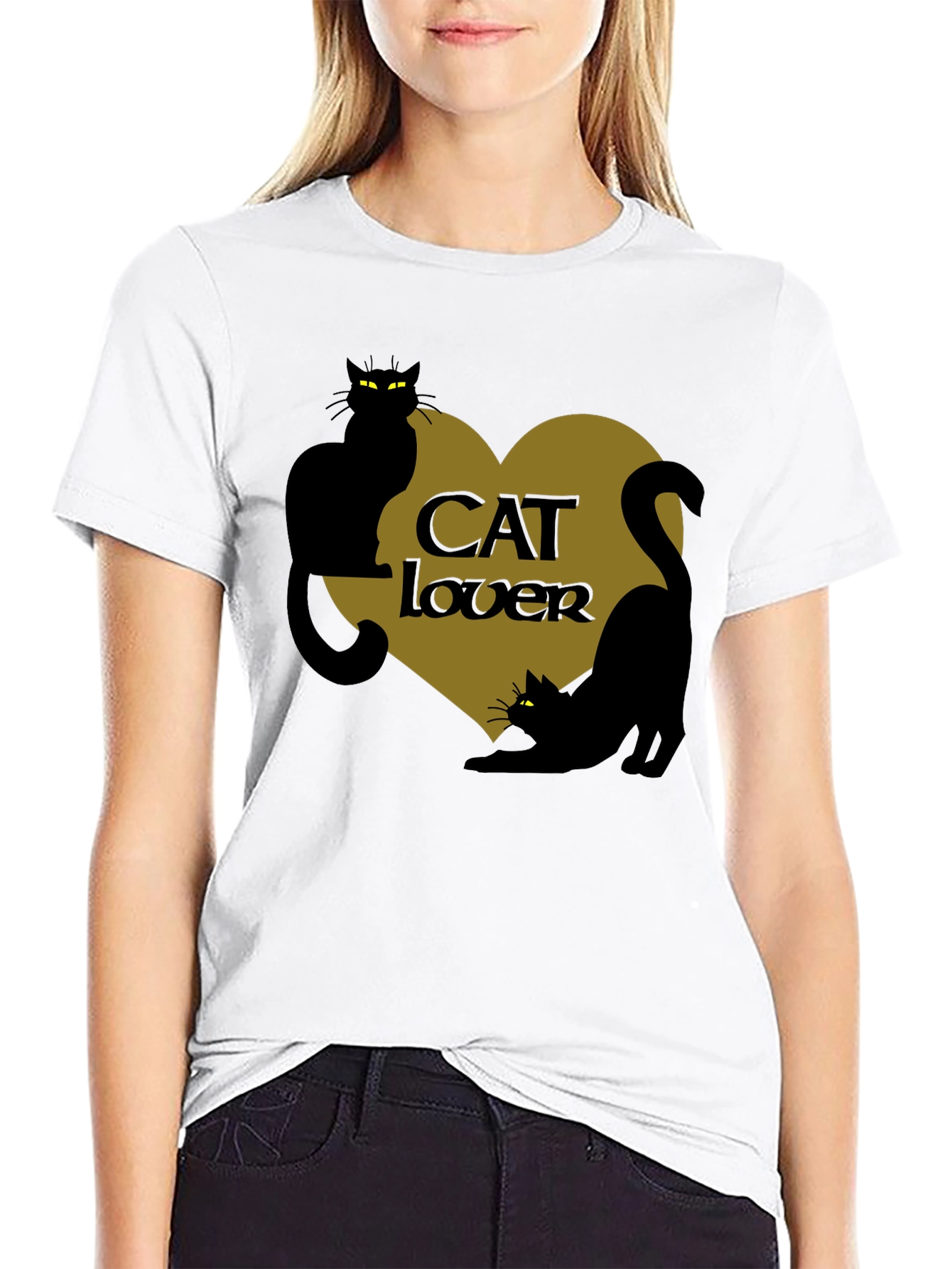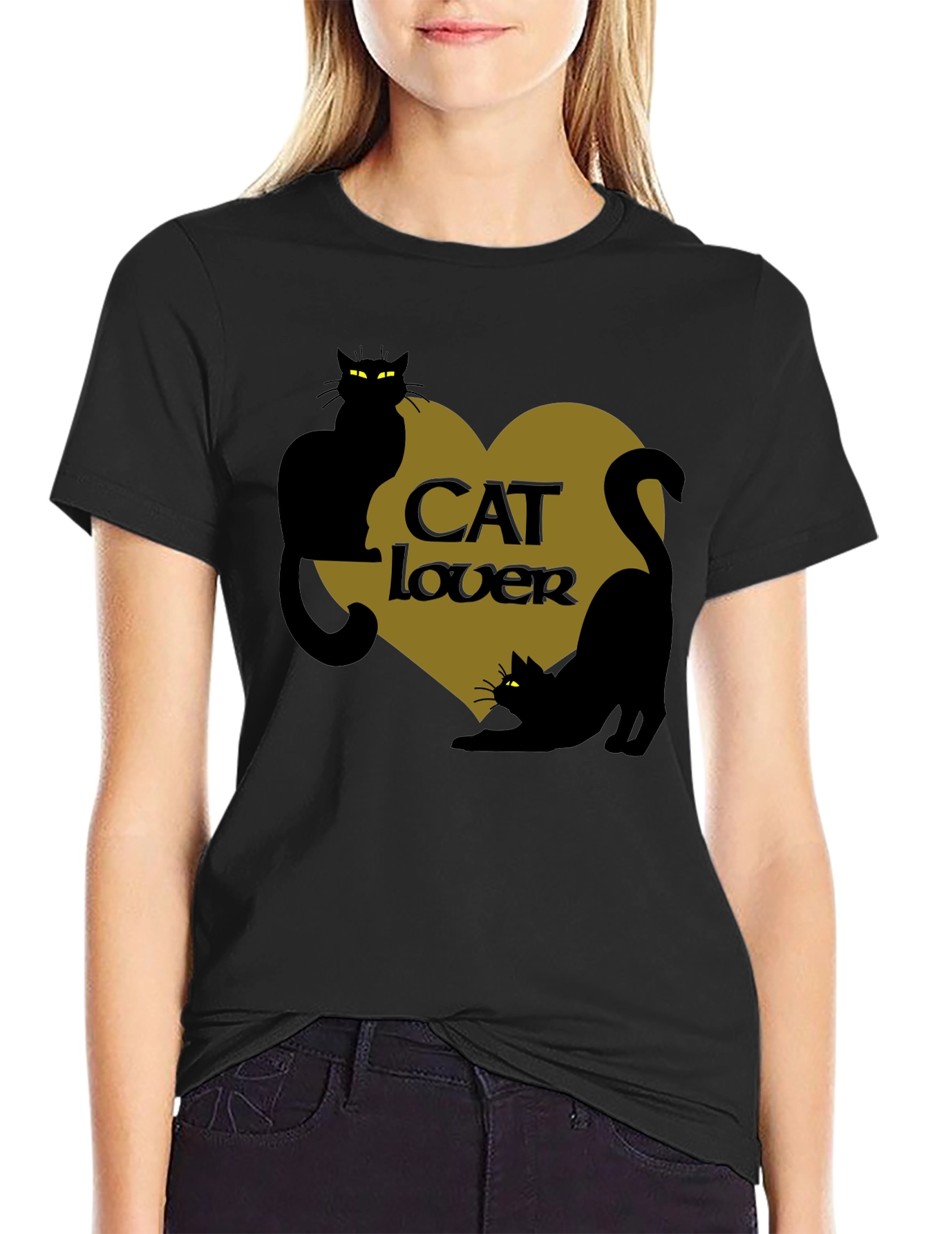 Show off your love for cats with this stylish black t-shirt. The shirt features a unique graphic of two black cats silhouetted against a gold heart. The words 'CAT lover' are placed in the center of the heart. The shirt is perfect for casual wear and is sure to turn heads. Wear this t-shirt to express your adoration for feline friends. It's ideal for cat owners, animal lovers, or anyone who appreciates unique and trendy apparel. This cool graphic tee makes a perfect gift for cat enthusiasts.