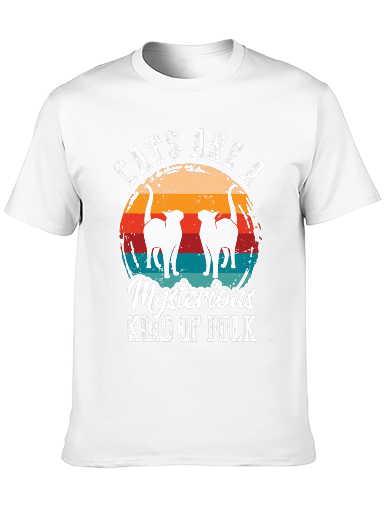 This eye-catching black t-shirt features a unique design perfect for cat lovers. The print showcases two black cat silhouettes against a vibrant retro sunset background. Above and below the image, the text "CATS ARE A Mysterious KIND OF FOLK" is displayed in a stylized, distressed white font. The shirt appears to be made of soft, comfortable material, suitable for everyday wear. Ideal for casual outings, cat-themed events, or as a gift for the feline fanatic in your life, this t-shirt combines comfort with a touch of whimsical charm.