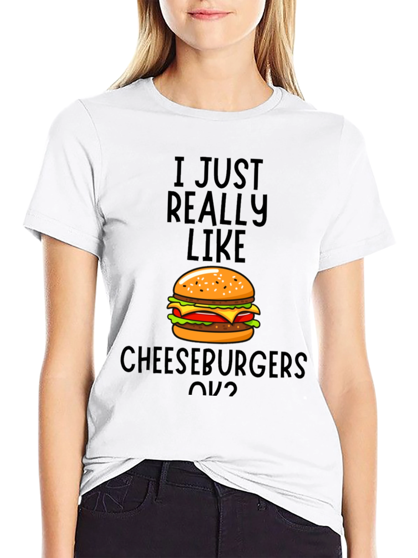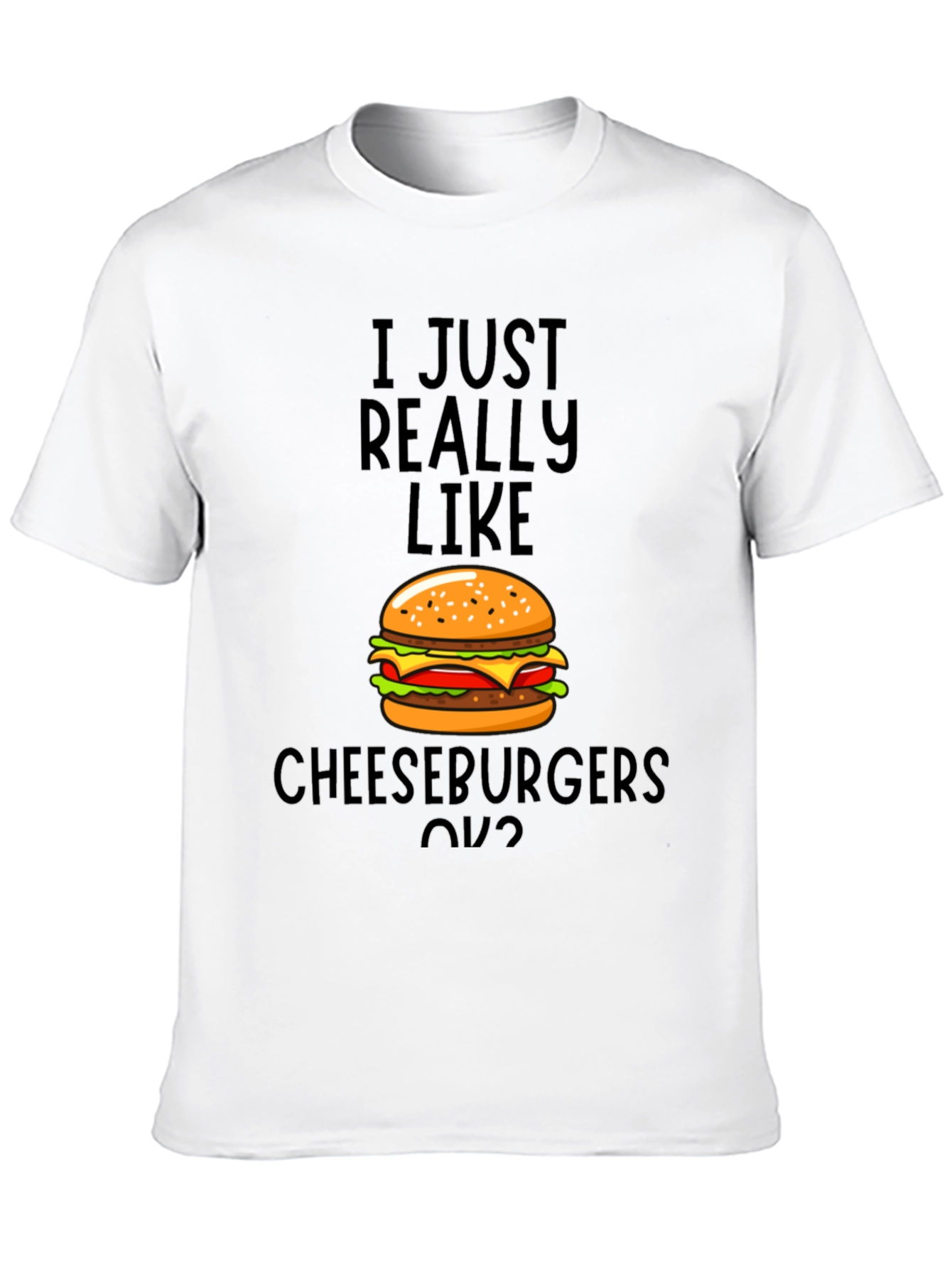 Show off your love for cheeseburgers with this fun and unique t-shirt! This black tee features a vibrant graphic of a delicious cheeseburger, paired with the witty phrase "I JUST REALLY LIKE CHEESEBURGERS OK?". Made from a soft and comfortable fabric, this shirt is perfect for everyday wear. It's a great conversation starter and a fun way to express your personality. Whether you're grilling out, grabbing a bite with friends, or just relaxing at home, this tee is sure to bring a smile to your face. Makes a great gift for the cheeseburger enthusiast in your life!