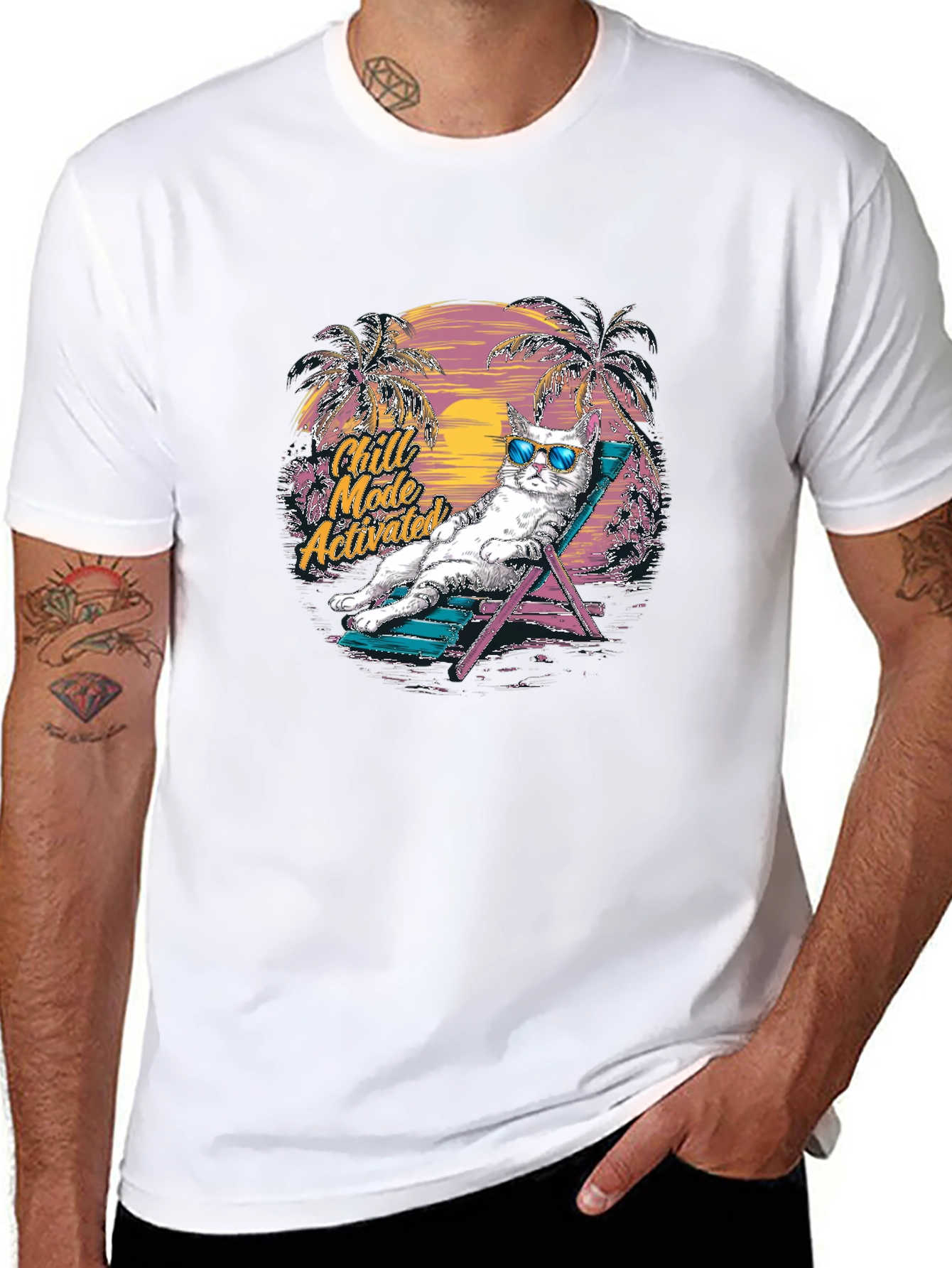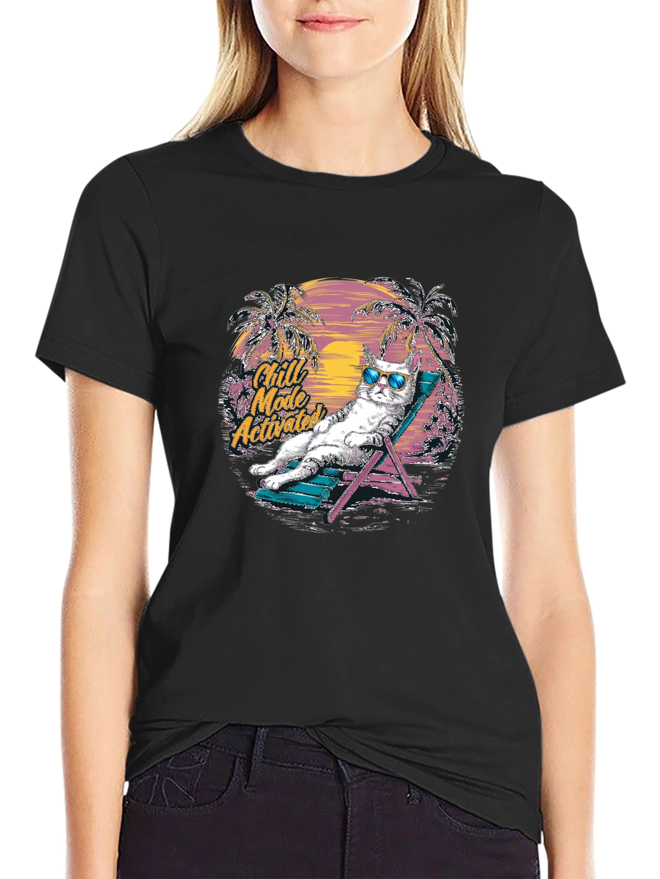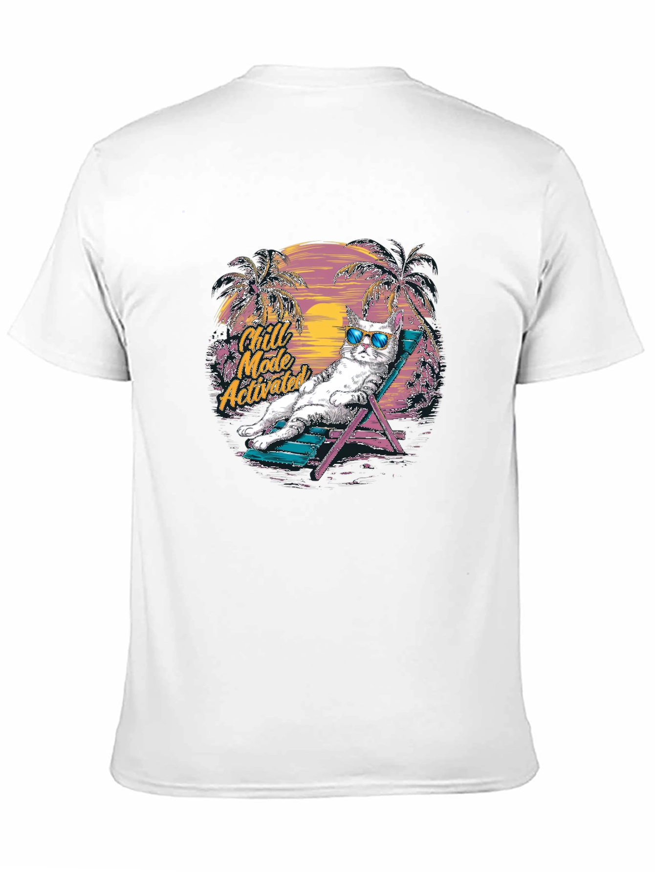 This trendy black t-shirt features a relaxed cat design, perfect for those who love a laid-back vibe. The graphic showcases a cool cat wearing sunglasses, lounging on a beach chair with palm trees and a sunset backdrop. The phrase 'Chill Mode Activated' adds a playful touch. Made from comfortable material, this tee is ideal for casual outings, lounging at home, or expressing your fun personality. This unique design will make a great addition to any wardrobe, or a perfect gift for cat lovers. Get yours today and embrace the chill!