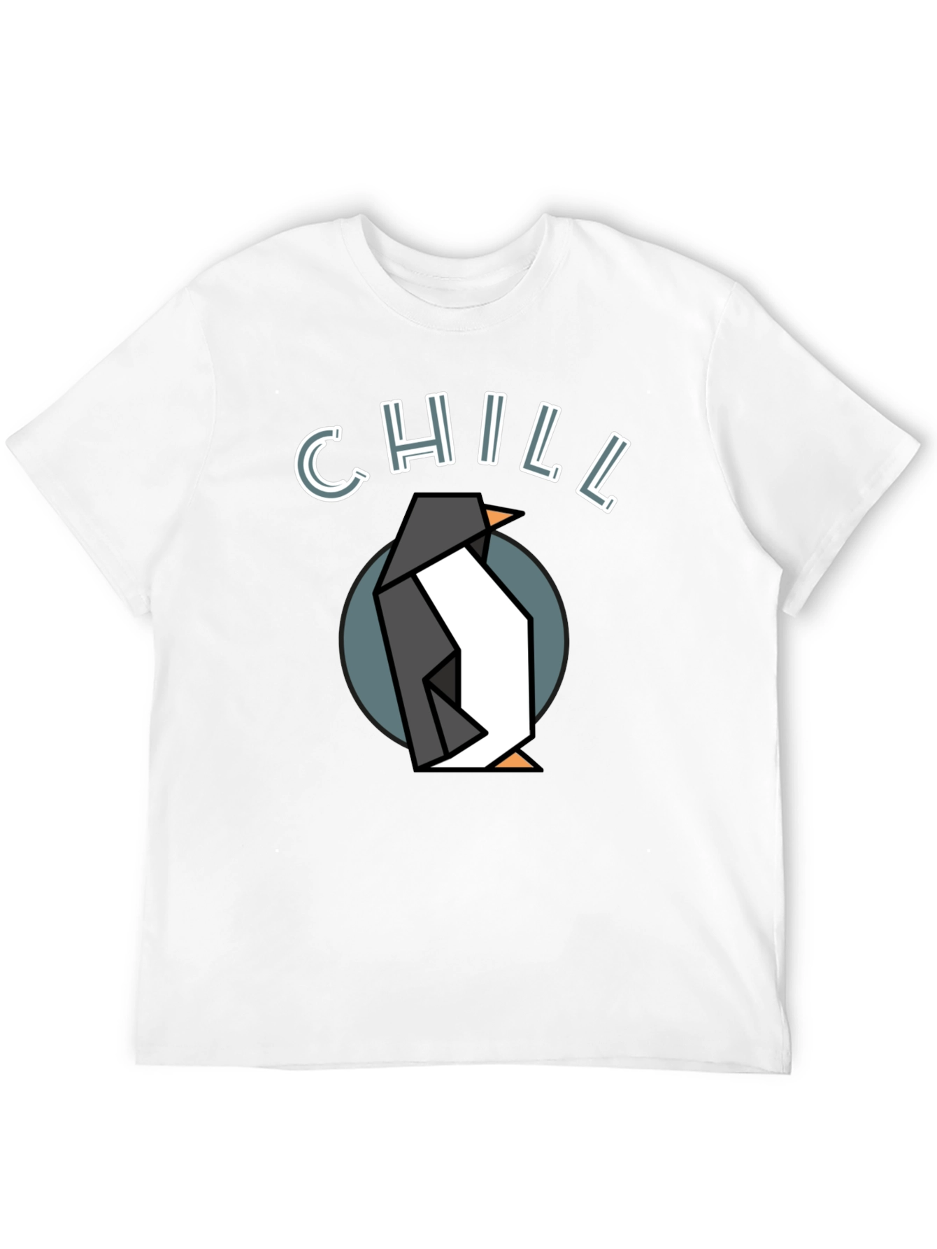 Stay cool and comfortable in this stylish black t-shirt featuring a unique geometric penguin design. The tee boasts a modern minimalist "CHILL" graphic above the stylized origami penguin, adding a touch of playfulness. Made from soft, breathable fabric, this tee offers all-day comfort. Perfect for casual outings, lounging at home, or expressing your unique style, this penguin tee is a must-have for any wardrobe. Show off your love for penguins and make a statement with this eye-catching graphic t-shirt.