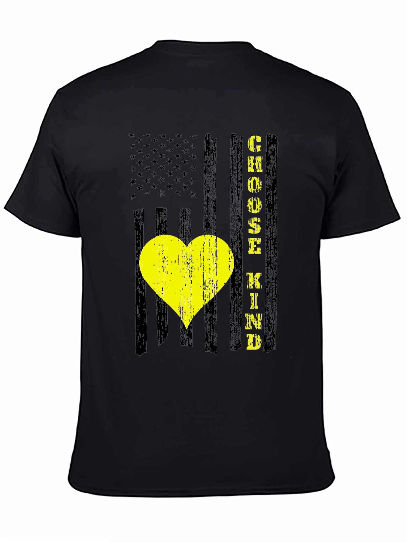 Show your support for kindness with this unique t-shirt. This black tee features a distressed American flag design with a yellow heart replacing the stars. The phrase "Choose Kind" is printed vertically alongside the flag. The vintage-style graphic gives the shirt a trendy and worn-in look. Made from a comfortable material, this casual t-shirt is perfect for everyday wear. Pair it with jeans or shorts for a casual and stylish look. Makes a great gift for anyone who believes in spreading positivity and kindness.