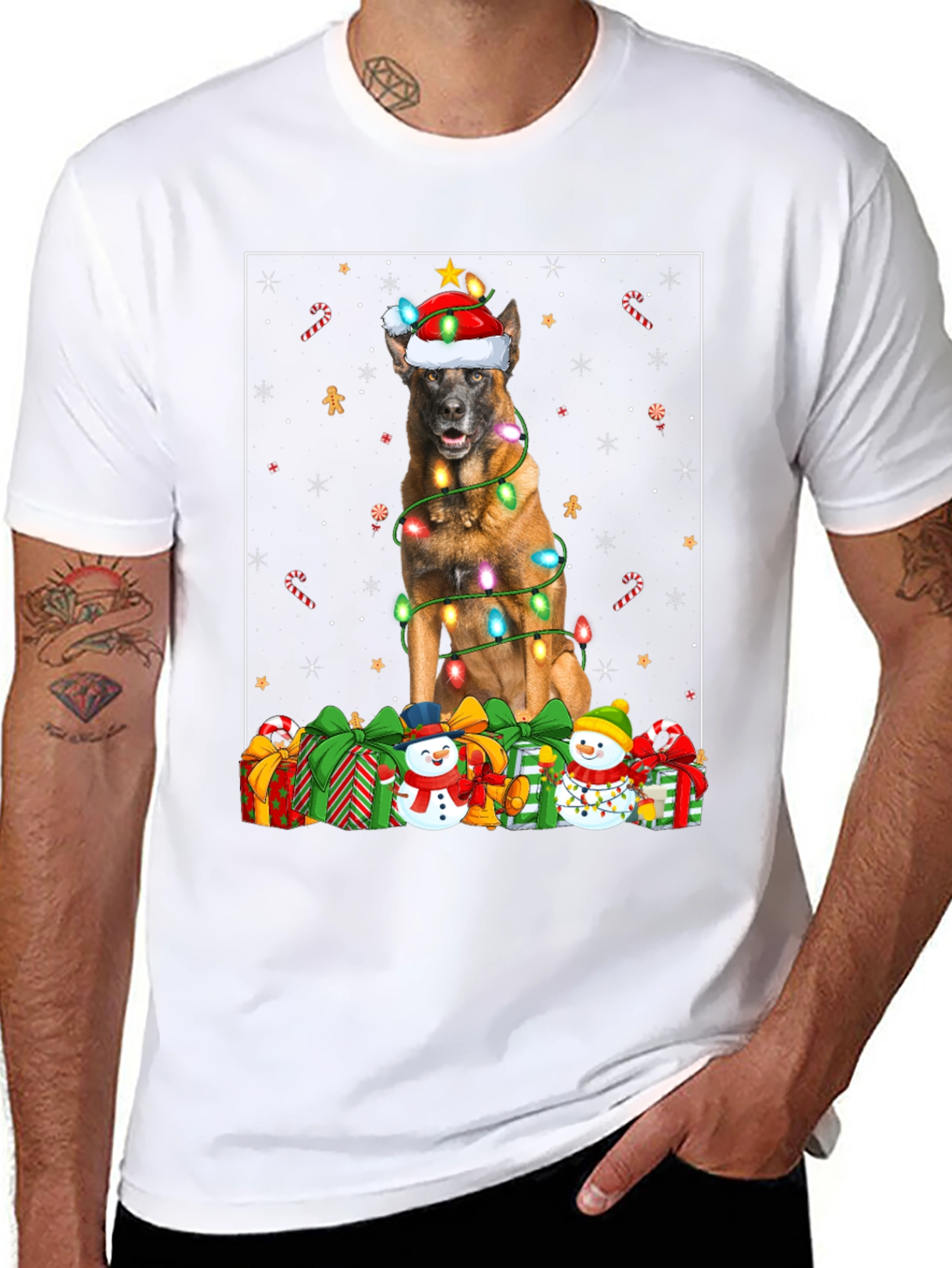 Get ready for the holiday season with this fun and festive t-shirt. It features a cute dog wearing a Santa hat, wrapped in Christmas lights, and surrounded by presents and snowmen. Made from soft, breathable cotton, this black t-shirt offers a comfortable fit for everyday wear. Perfect for dog lovers and Christmas enthusiasts alike, it's sure to spread holiday cheer wherever you go. Wear it to holiday parties, family gatherings, or simply while enjoying the festive atmosphere. This unique design will definitely make you stand out and bring smiles to everyone's faces.