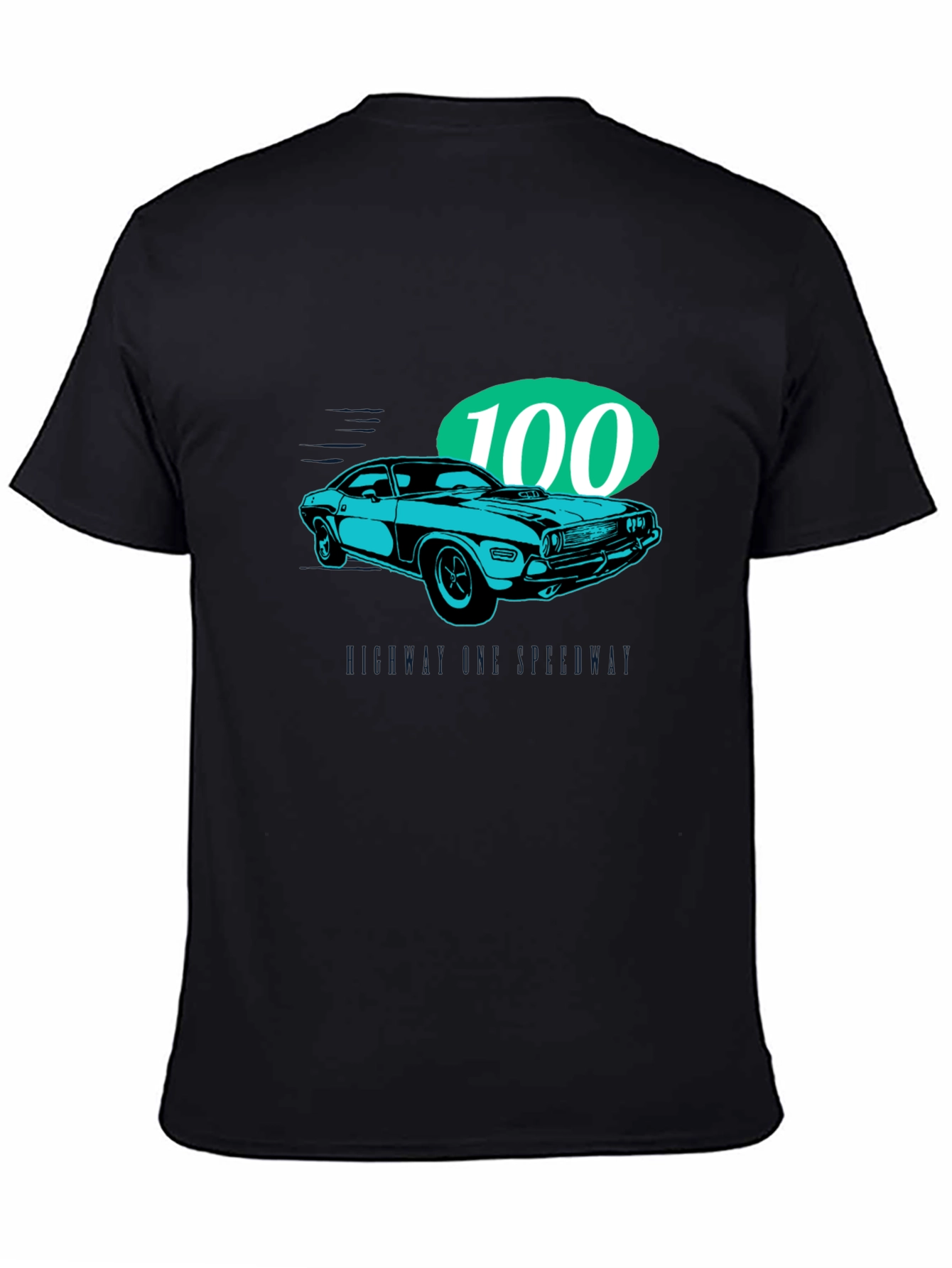 Showcase your love for vintage cars with this stylish black t-shirt. The design features a bold, teal-colored classic car graphic with "100" boldly displayed above it, set against a vibrant green oval backdrop. Made from soft, breathable fabric, this tee offers both comfort and style. Perfect for casual outings, car shows, or simply relaxing at home, this t-shirt is a must-have for any car enthusiast's wardrobe. Stand out with this eye-catching and unique apparel piece.