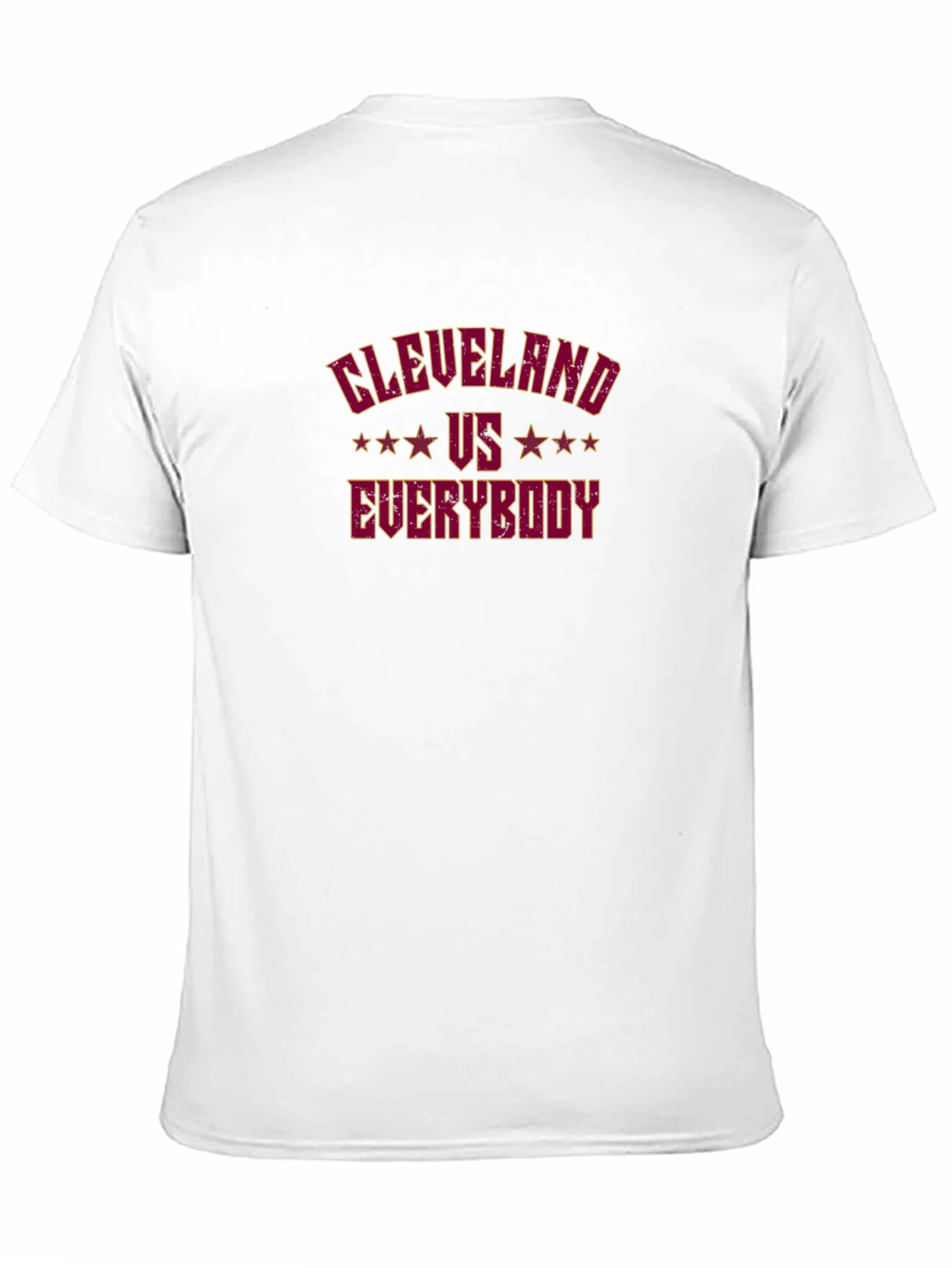 Show your Cleveland pride with this bold graphic tee! This black t-shirt features a striking "Cleveland VS Everybody" design in a classic collegiate font. The distressed burgundy text is framed by eye-catching star graphics, giving it a vintage, worn-in feel. Made from a soft, breathable fabric, this shirt is perfect for everyday wear, whether you're hitting the gym, cheering on your favorite team, or just hanging out with friends. This tee will make a statement wherever you go. Wear your loyalty on your sleeve and represent your city with style!