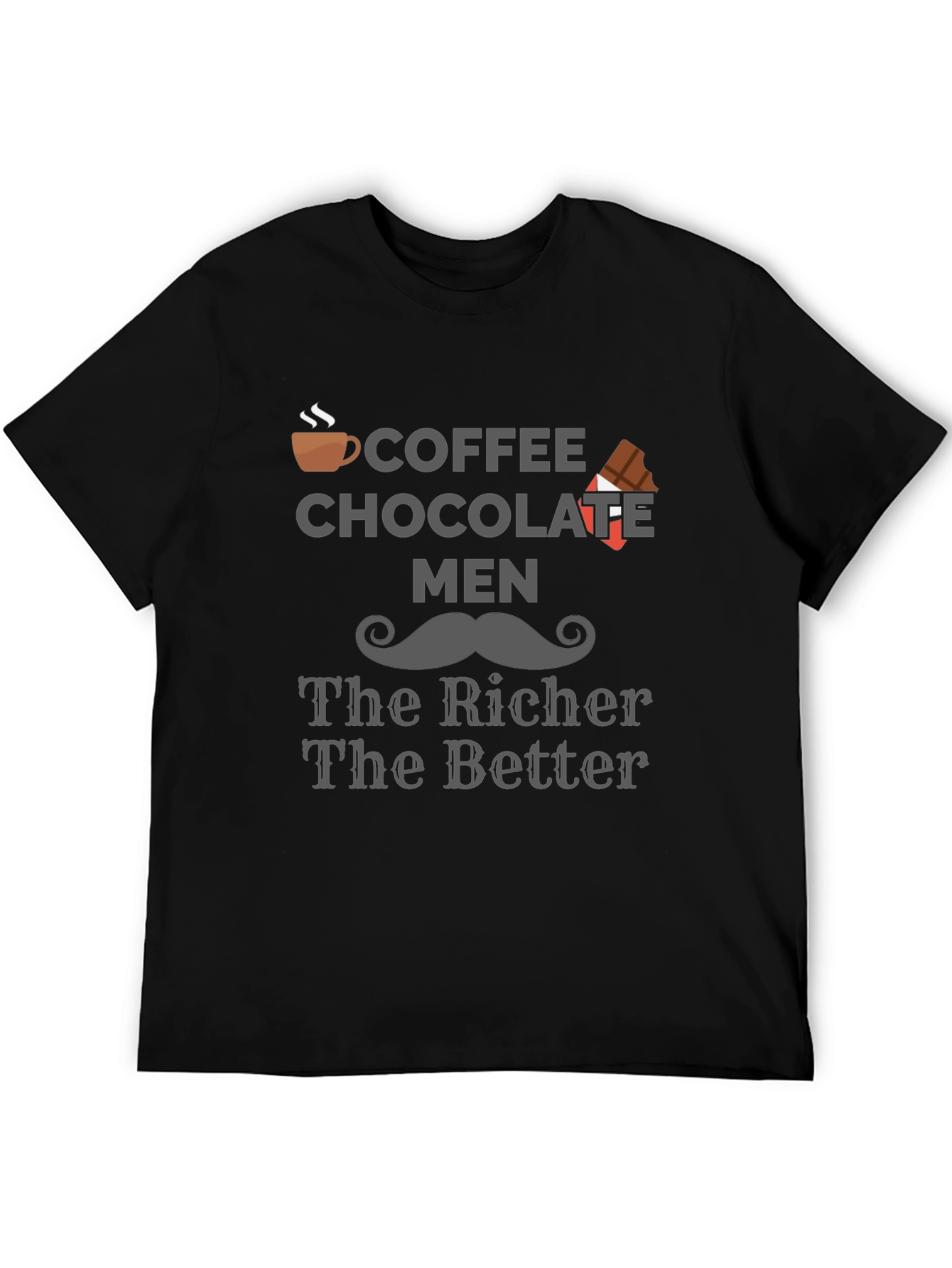 Indulge in the perfect blend of humor and style with this unique graphic t-shirt. Featuring a clever design that combines coffee, chocolate, and a playful mustache, this shirt is perfect for the man who enjoys the finer things in life. The phrase 'The Richer The Better' adds a touch of wit and sophistication. Crafted from a soft, breathable fabric, this tee ensures all-day comfort. Its classic fit makes it a versatile addition to any wardrobe, easily paired with jeans, shorts, or casual trousers. Whether you're a coffee aficionado, a chocolate lover, or simply appreciate a good joke, this shirt is sure to be a conversation starter. Show off your personality and sense of humor with this must-have tee!