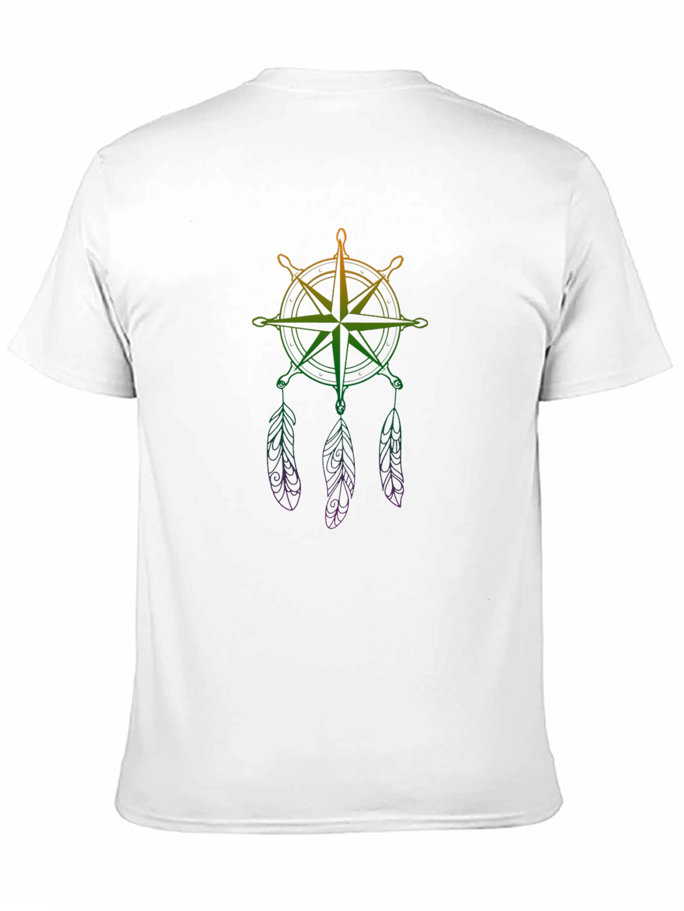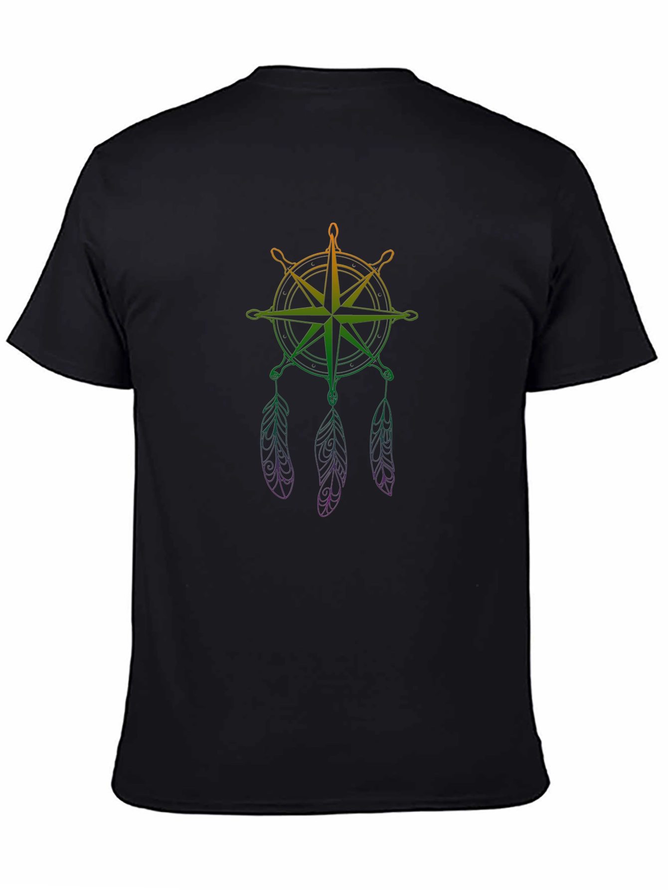 Embrace your adventurous spirit with this stylish black tee! It features a unique graphic of a compass rose interwoven with a dreamcatcher design. The vibrant color gradient from orange to green to purple adds a modern and eye-catching touch. Made from a comfortable, breathable fabric, this t-shirt is perfect for everyday wear or casual outings. Show off your love for travel and exploration with this one-of-a-kind design. Pair it with jeans or shorts for a relaxed, cool look. A must-have for anyone with a free spirit and a passion for wanderlust!
