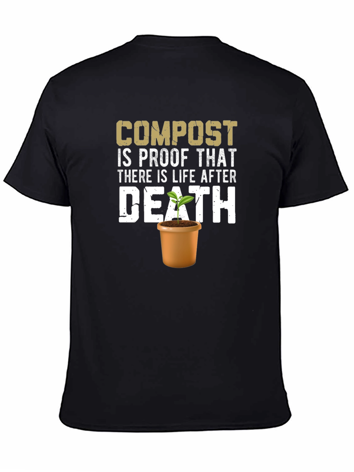 This black t-shirt features a clever and eco-conscious design. The statement "COMPOST IS PROOF THAT THERE IS LIFE AFTER DEATH" is prominently displayed in a bold, distressed font, with "COMPOST" in a golden hue and the rest in white. Below the text, a potted plant image adds a touch of nature and reinforces the message. Made from what appears to be a soft and comfortable fabric, this tee is perfect for gardeners, environmental enthusiasts, or anyone with a sense of humor about sustainability. It's a unique way to show your love for the planet and spark conversations about the life cycle.