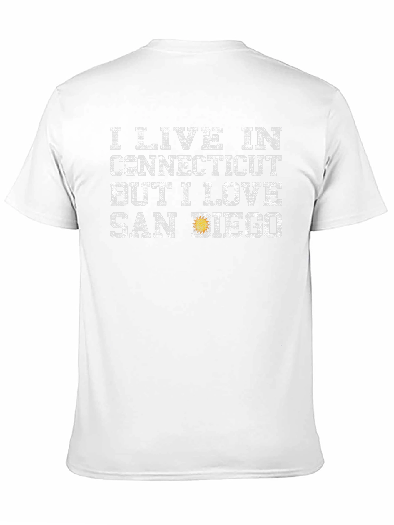 Show your unique love for San Diego while residing in Connecticut with this eye-catching graphic tee. The shirt features bold, distressed-style text that reads "I LIVE IN CONNECTICUT BUT I LOVE SAN DIEGO," with a sun graphic replacing the 'O' in San Diego. Made from a comfortable, breathable fabric, this classic black tee offers a relaxed fit that's perfect for everyday wear. Whether you're a former resident, a frequent visitor, or simply a die-hard fan, this shirt is a stylish way to express your affection for the sunny city. Wear it to casual outings, social gatherings, or just lounging around – it's sure to spark conversations and turn heads!
