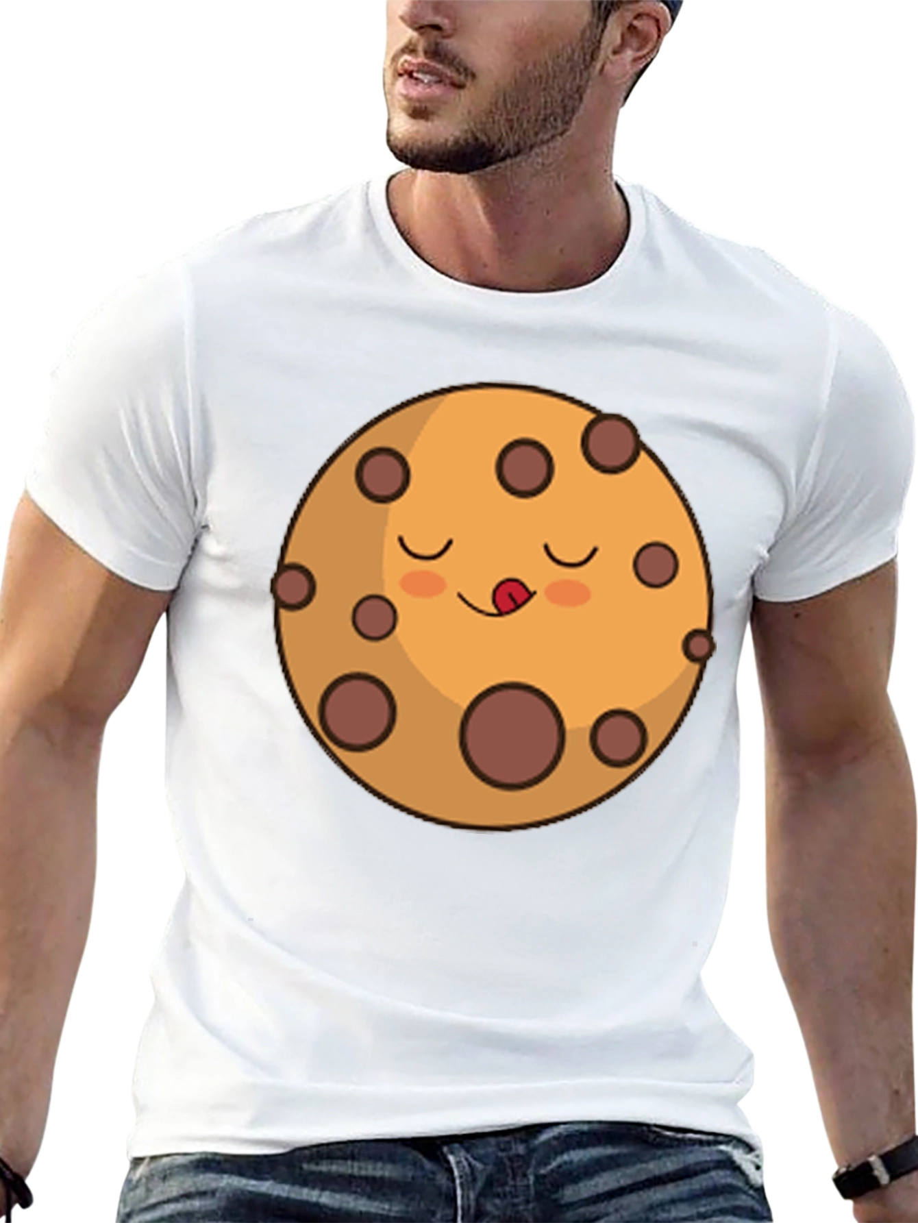 Indulge your sweet tooth with this playful black t-shirt featuring a charming cookie graphic. The delightful cookie design with its closed eyes and cute tongue adds a touch of fun to your everyday style. Made from soft, breathable fabric, this tee offers all-day comfort whether you're lounging at home, heading out with friends, or expressing your unique personality. Perfect for cookie enthusiasts and those who appreciate quirky fashion, this shirt is sure to spark smiles and conversations. Pair it with your favorite jeans or shorts for a casual, effortless look. Add a dash of sweetness to your wardrobe today!