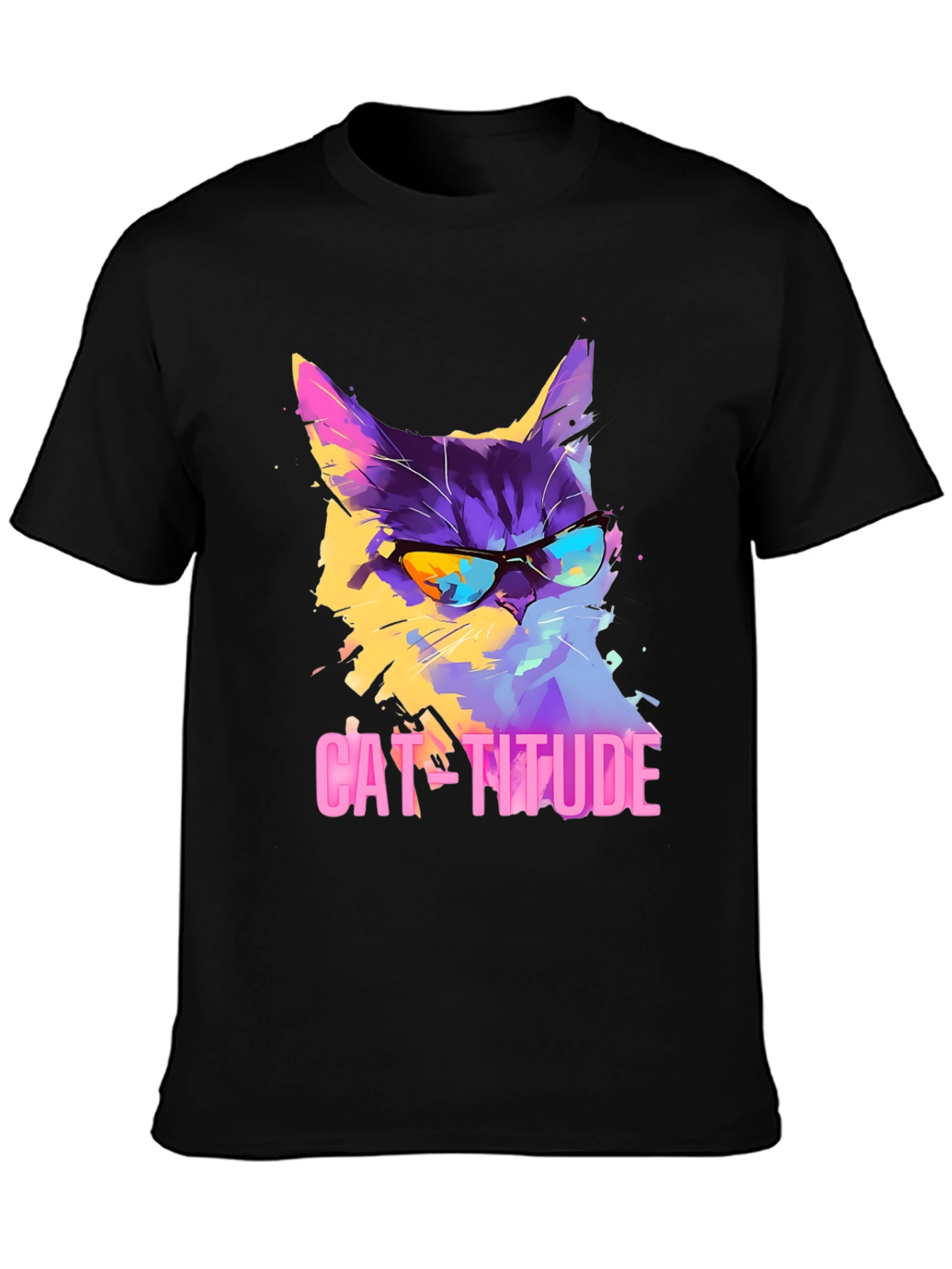 Show off your cool side with this unique black t-shirt featuring a vibrant, stylized cat graphic. The eye-catching design includes a cat wearing sunglasses and the playful text "CAT-TITUDE". The print is bright and colorful, making it a real statement piece. Made from a comfortable fabric, this tee is perfect for casual wear, parties, or expressing your love for cats. Pair it with jeans or shorts for a fun and fashionable look. This tee is sure to turn heads and spark conversations. A must-have for cat lovers and anyone who enjoys bold graphic apparel.