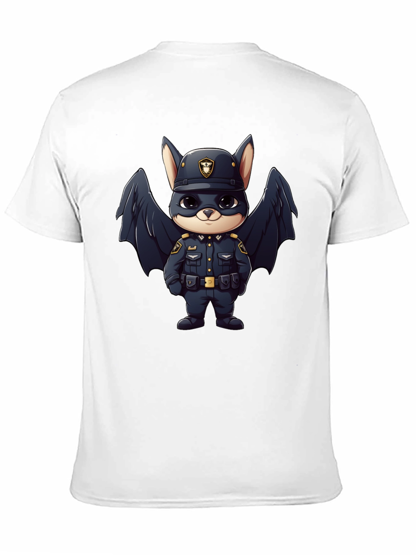This black t-shirt features a cartoon bat dressed in a police officer's uniform, complete with a hat and badge. The charming graphic adds a playful touch to the classic tee, perfect for casual wear. Made from comfortable materials, it's ideal for expressing your fun side. A unique design makes it a great conversation starter. This t-shirt will add personality to any outfit. Get yours today!