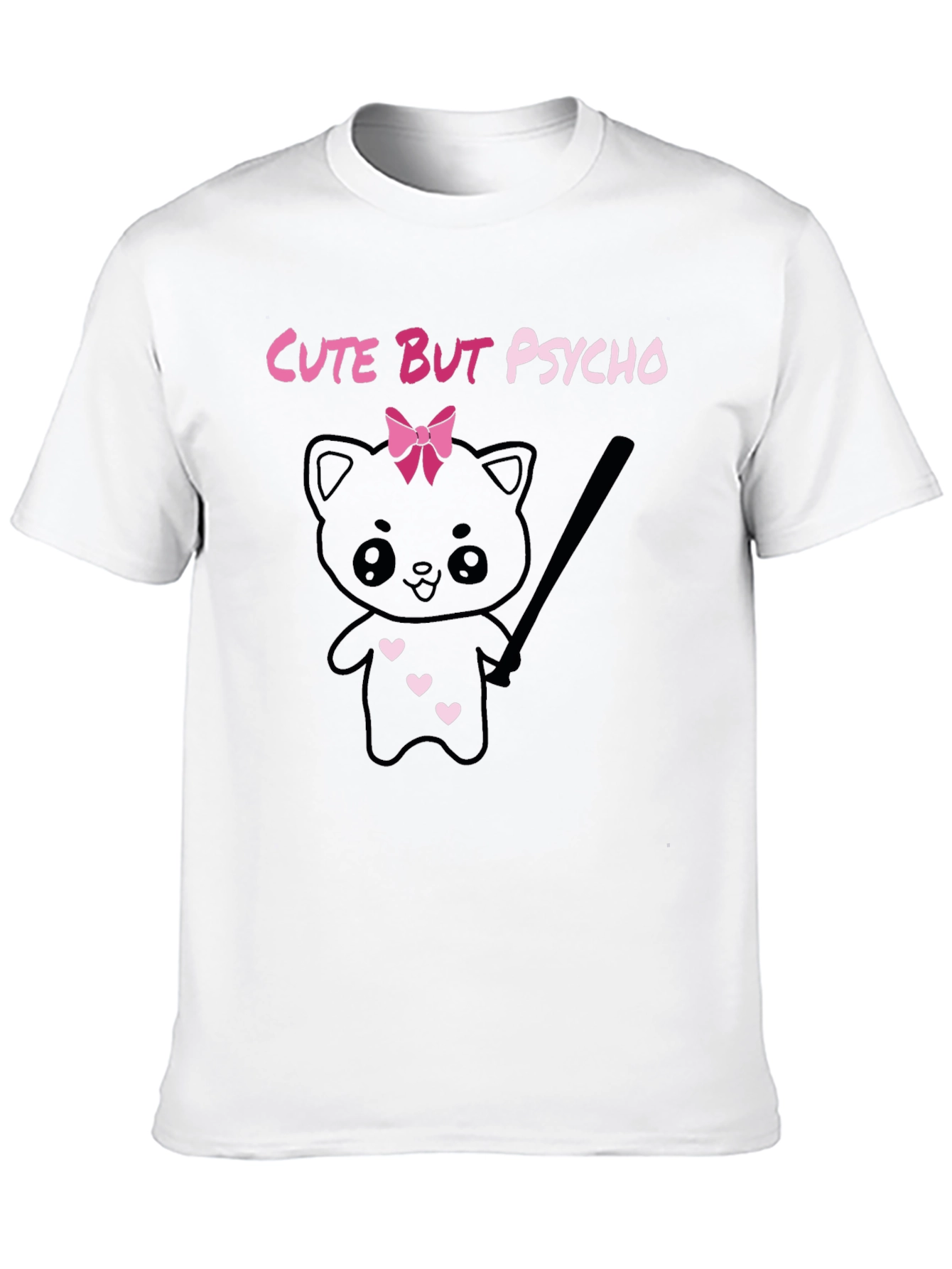 Show off your unique style with this Cute But Psycho T-shirt. This tee features a playful yet edgy design with a cartoon cat character holding a bat. Made from soft, breathable fabric, this shirt offers all-day comfort. Perfect for casual outings, parties, or expressing your bold personality, this tee is sure to turn heads and spark conversations. Available in black and is a must-have addition to any fashion-forward wardrobe. Get yours today and embrace your inner cuteness with a hint of psycho!