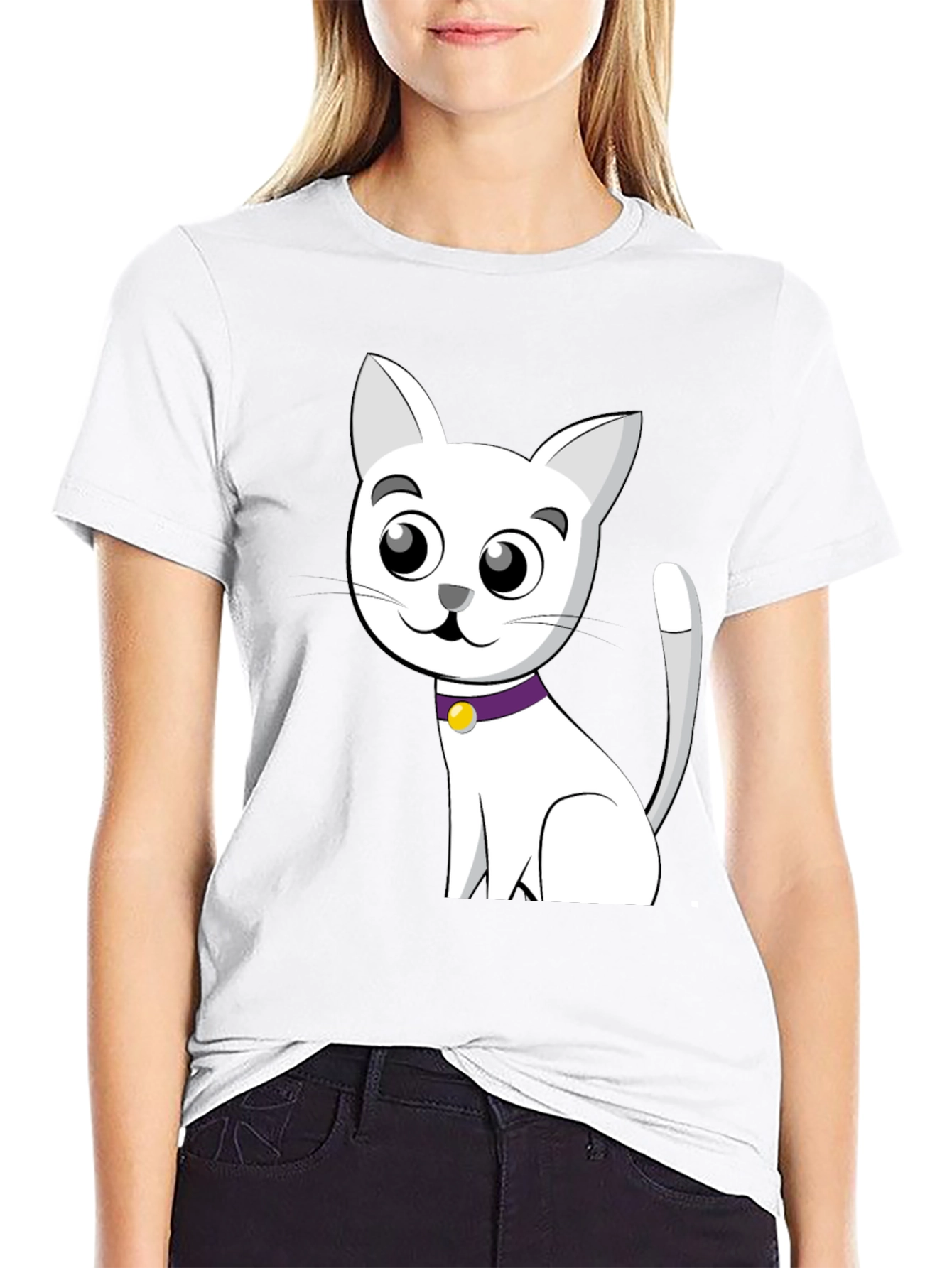 Show off your love for cats with this adorable black T-shirt! Featuring a charming cartoon cat design, this tee is perfect for casual wear. The white cat graphic is complete with a purple collar and a playful expression. Made from comfortable materials, this unisex shirt offers a relaxed fit suitable for everyday activities. Whether you're a cat lover yourself or looking for a unique gift, this cat graphic tee is sure to bring a smile. Get ready to turn heads and spark conversations with this eye-catching design!