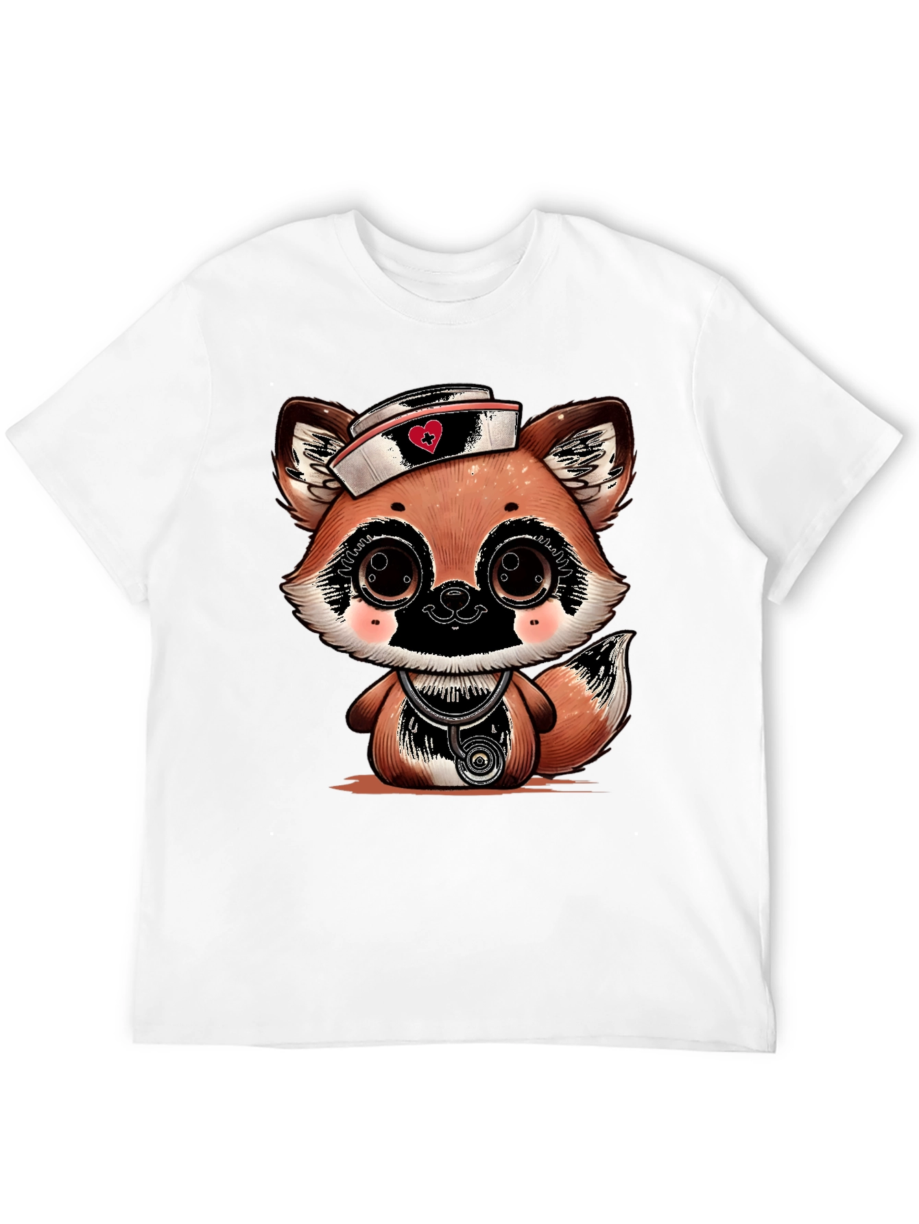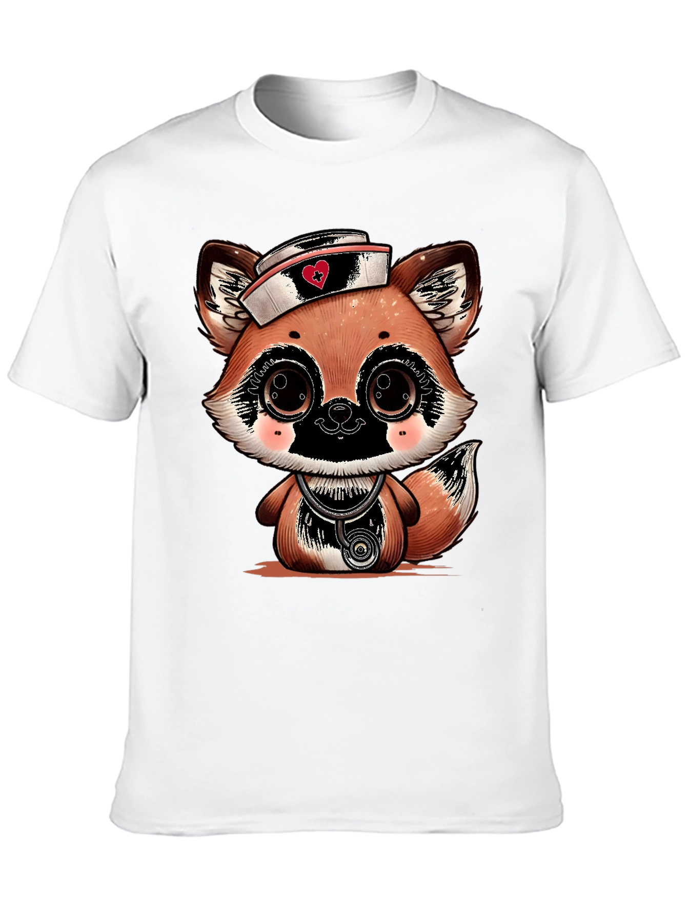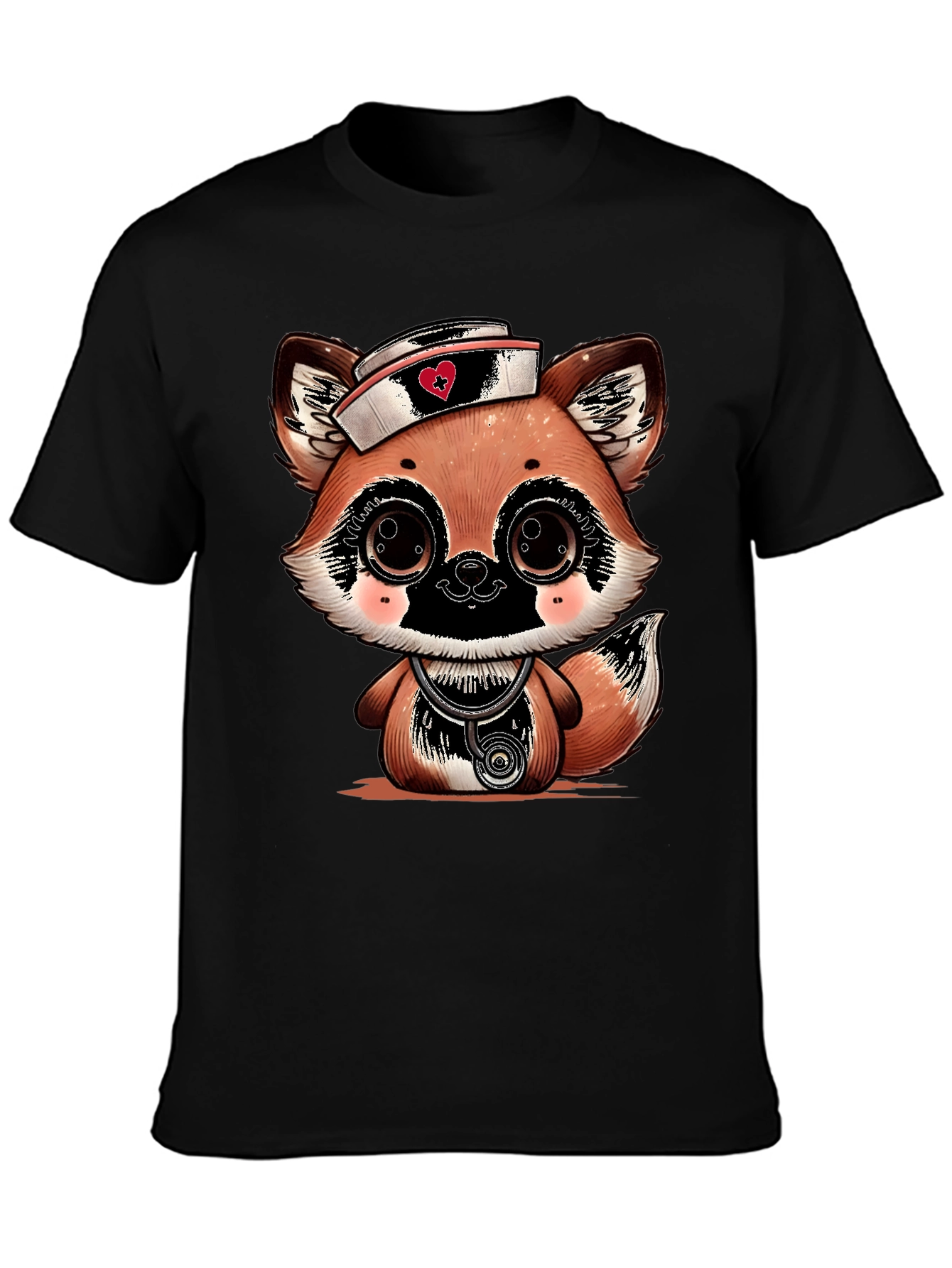 This black t-shirt features a charming cartoon illustration of a fox dressed as a nurse. The adorable fox is wearing a traditional nurse's cap adorned with a red heart and a stethoscope around its neck. With its big, captivating eyes and fluffy tail, the design is sure to bring a smile to anyone's face. Made from a comfortable-looking fabric, this tee is perfect for casual wear, healthcare professionals, or anyone who loves cute and quirky designs. It's an ideal gift for nurses, animal lovers, or a fun addition to your own wardrobe. Get ready to receive compliments on this unique and heartwarming piece!