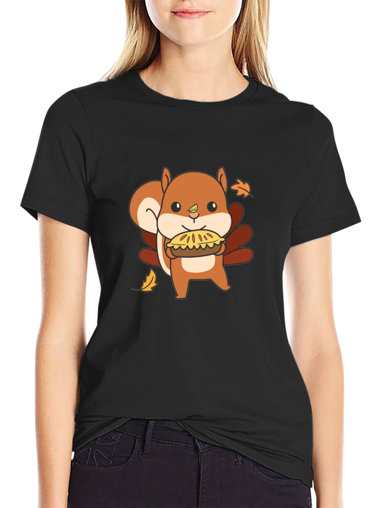 Celebrate Thanksgiving in style with this adorable black t-shirt. Featuring a charming cartoon squirrel design, this shirt is perfect for the holiday season. The squirrel is depicted holding a delicious-looking pie, surrounded by falling autumn leaves. Made from comfortable, breathable fabric, this t-shirt is ideal for casual wear during Thanksgiving gatherings, fall outings, or simply to show off your festive spirit. Get ready to spread some holiday cheer with this unique and eye-catching tee!