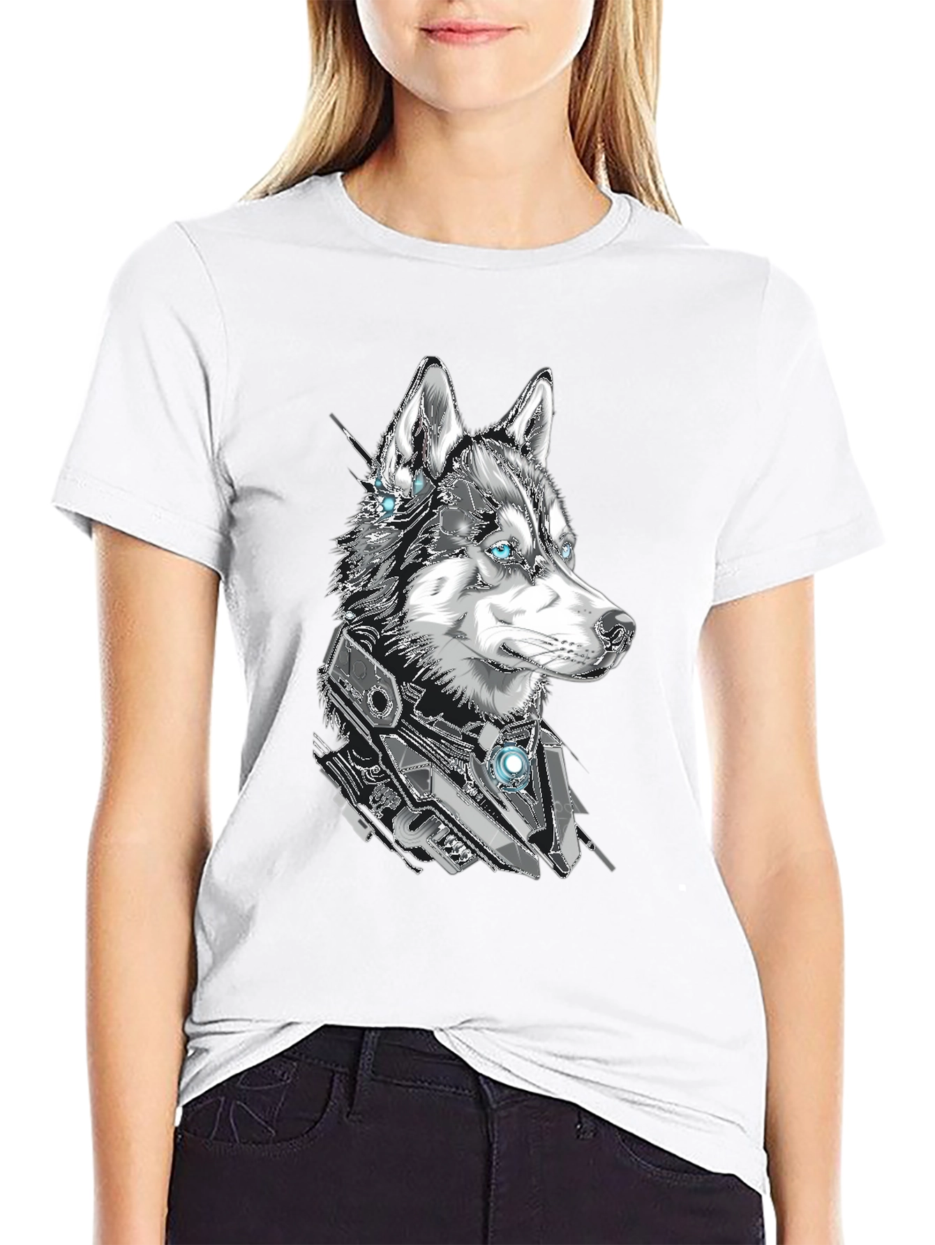 Show off your unique style with this striking black t-shirt. Featuring a bold cyberpunk-inspired design of a husky, this shirt blends nature and technology in an eye-catching graphic. The detailed artwork showcases a husky with futuristic cybernetic enhancements, creating a visually stunning and modern look. Made from comfortable fabric, this tee is perfect for everyday wear, concerts, or casual outings. Stand out from the crowd and express your love for animals and futuristic aesthetics with this must-have graphic tee.