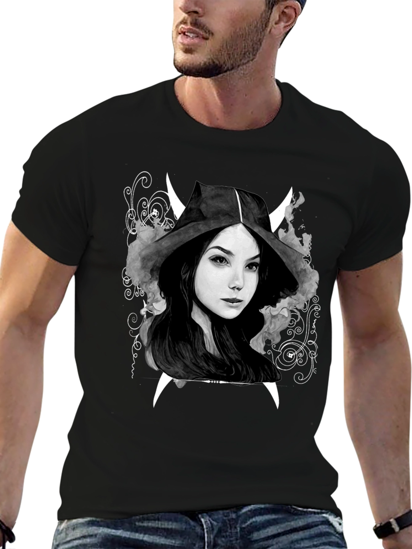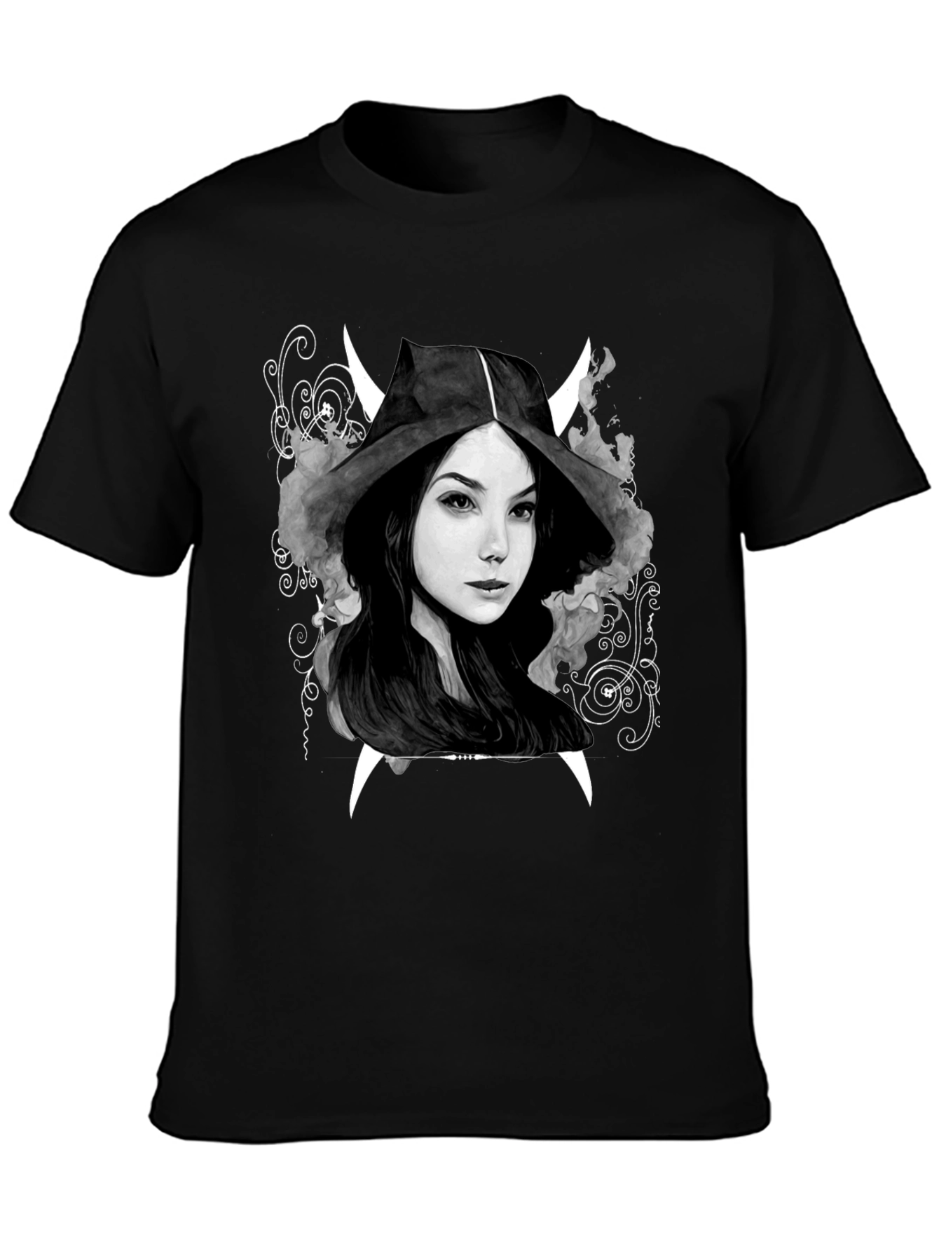Embrace your dark side with this striking men's black t-shirt. Featuring a bold graphic of a mysterious dark-haired witch with a wide-brimmed hat, the design is both captivating and eerie. The high-contrast black and white print stands out against the tee's dark background, making it a stylish statement piece. Perfect for casual wear, Halloween events, or expressing your unique personality. Made from comfortable cotton fabric, this tee offers both style and comfort. Add a touch of gothic charm to your wardrobe with this must-have t-shirt.