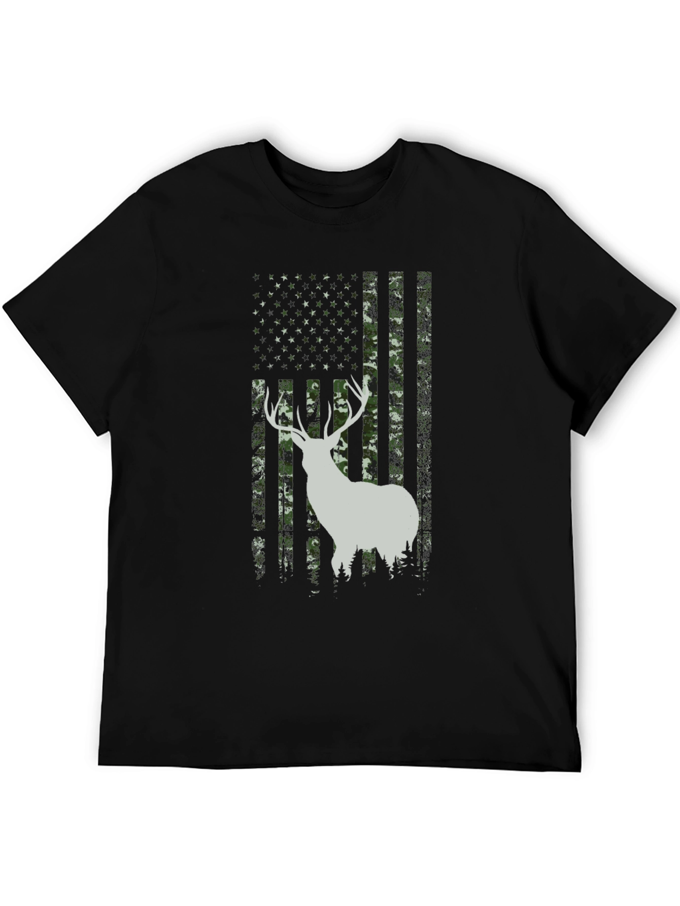 Show off your love for the outdoors with this unique men's t-shirt! Featuring a distressed American flag design filled with a woodland camouflage pattern, this tee is perfect for hunters and nature enthusiasts alike. A bold white deer silhouette stands proudly against the flag, creating a striking visual. Made from comfortable, breathable fabric, this shirt is ideal for everyday wear or your next hunting trip. Makes a great gift for the outdoorsman in your life. Grab yours today and showcase your passion!