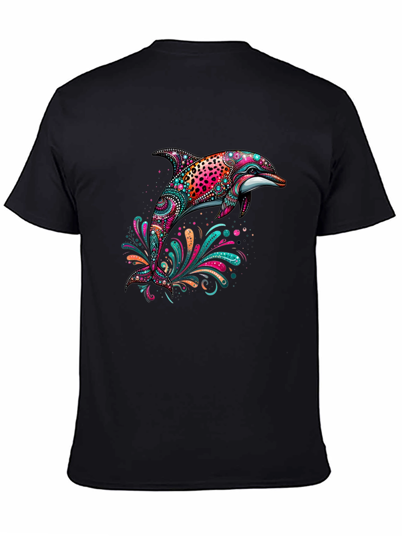 Dive into style with this vibrant black tee! Featuring a stunning art print of a dolphin leaping from colorful, swirling water, this shirt is a true statement piece. The dolphin design is intricately detailed with a mix of bold colors and patterns, creating an eye-catching visual effect. Made from a soft, comfortable fabric, this t-shirt is perfect for everyday wear or casual outings. The classic crew neck and short sleeves ensure a relaxed fit. Show off your love for marine life and artistic flair with this unique tee. Perfect for adding a splash of color to your wardrobe!
