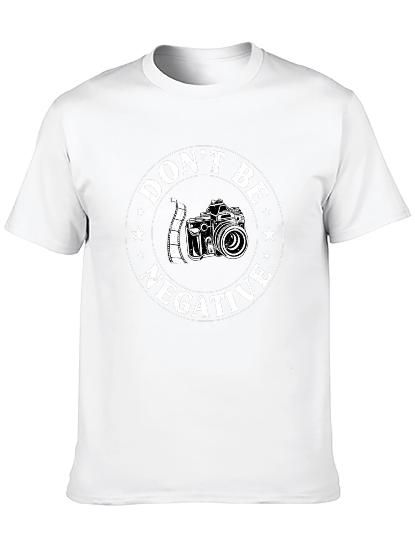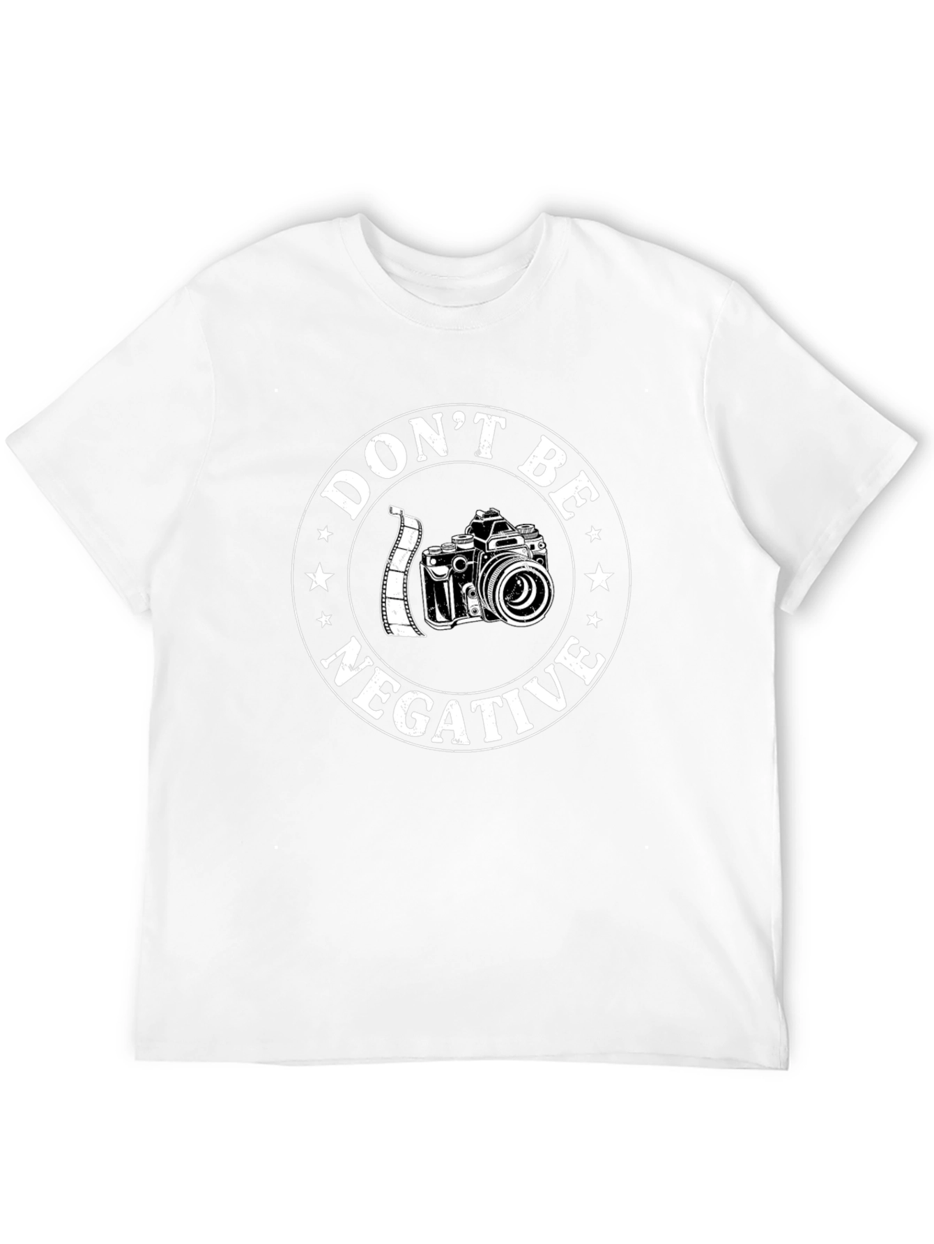 This black graphic t-shirt features a creative design for photography enthusiasts. A vintage-style camera is encircled by the phrase "Don't Be Negative" and accented with stars. The circular graphic is printed in white, contrasting against the black tee. The t-shirt appears to be made of a soft and comfortable material. Perfect for casual wear, photography meetups, or as a gift for a photographer, this tee will express your passion and positive attitude. The classic fit ensures a comfortable wear, making it a versatile addition to any wardrobe.
