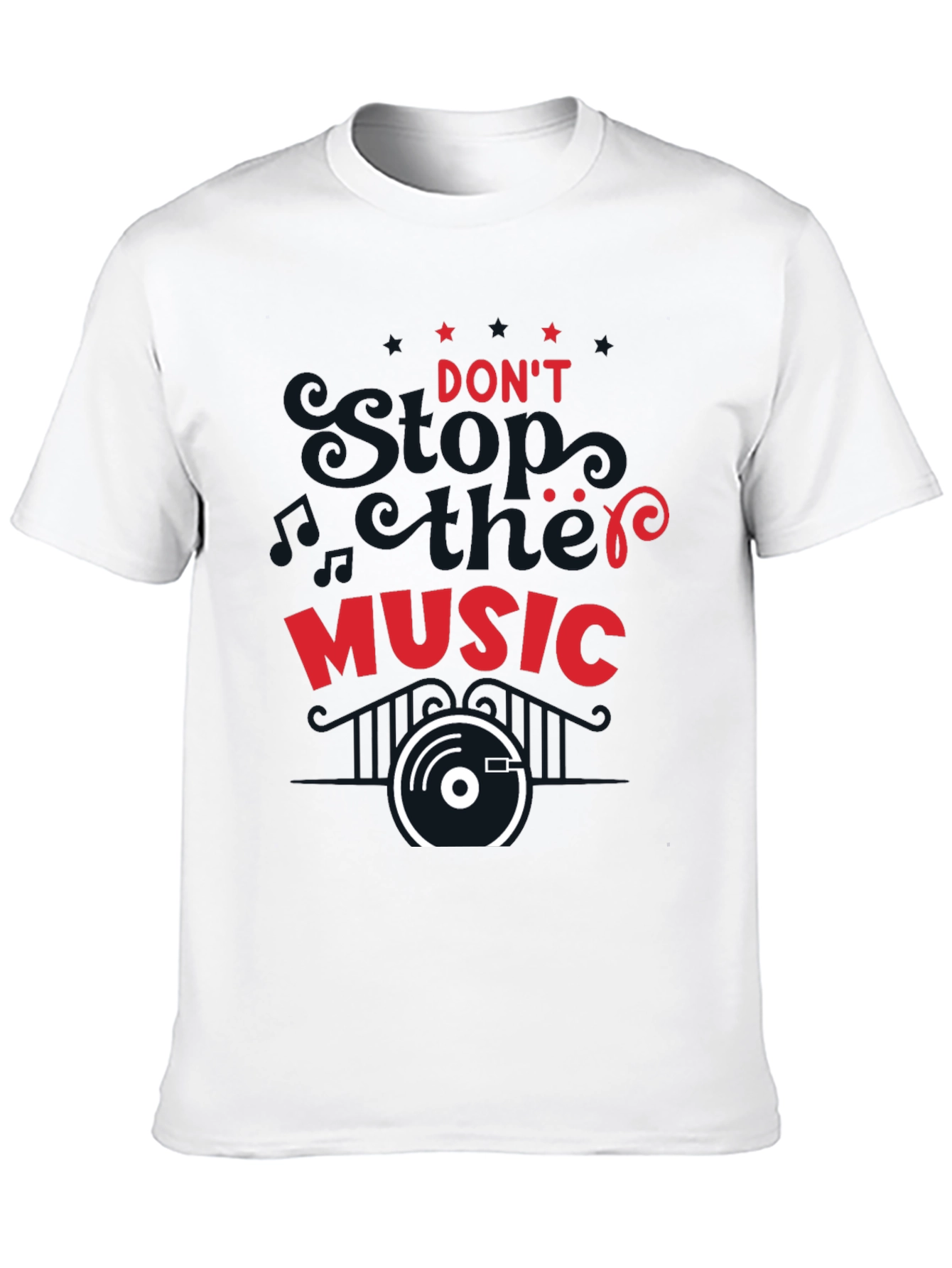 Rock your style with this eye-catching black t-shirt featuring a vibrant 'Don't Stop the Music' graphic. The design incorporates playful typography in contrasting red and blue, a record graphic and musical notes. Made from a comfortable, breathable fabric, this tee is perfect for everyday wear, music festivals, or casual outings. Show off your love for music with this unique and stylish piece. It's a great conversation starter and a must-have for any music enthusiast's wardrobe.