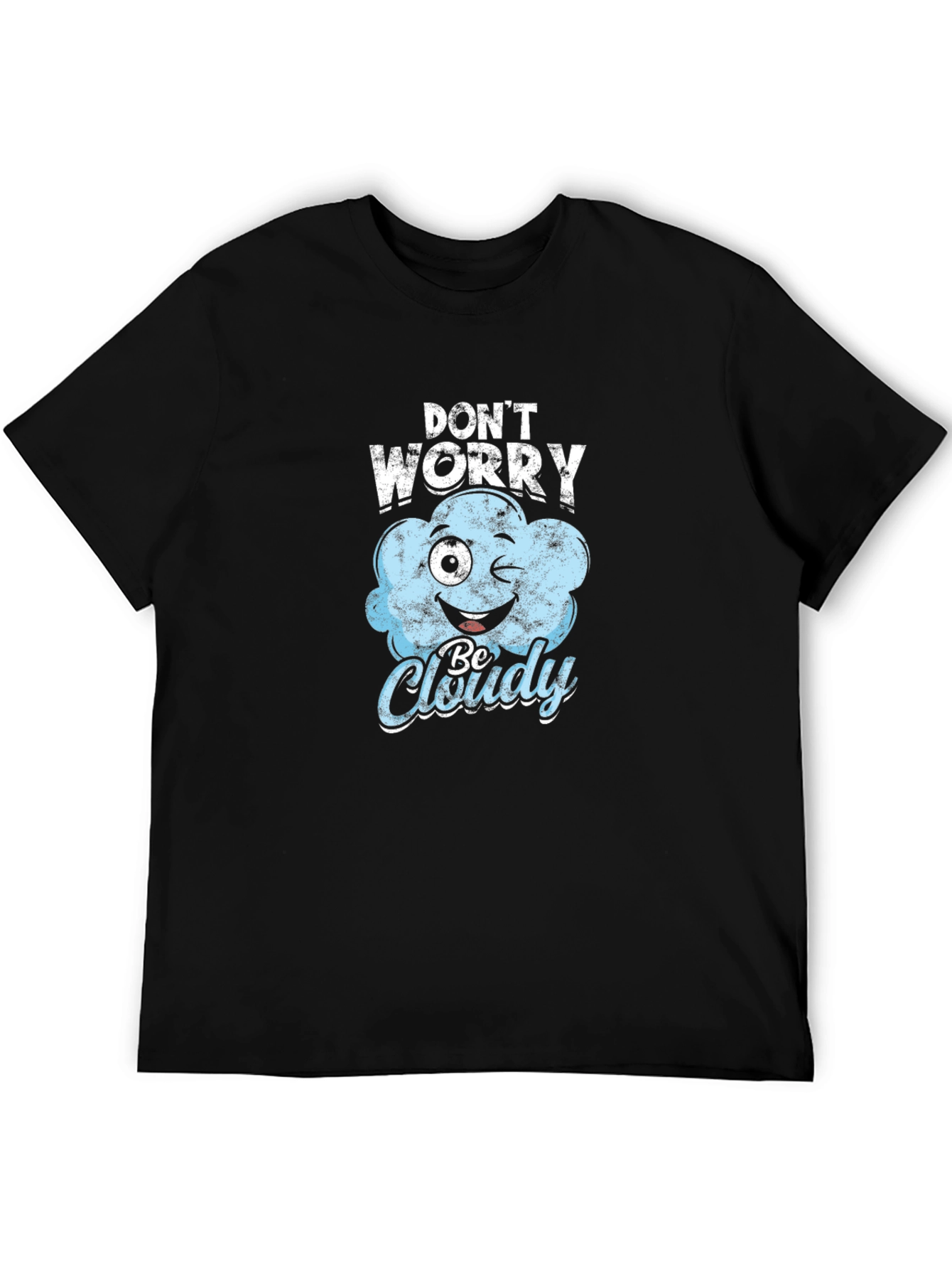 This black t-shirt features a playful and whimsical design that's sure to bring a smile to your face. The print showcases a cartoon cloud with a winking eye and cheerful smile, accompanied by the witty phrase 'Don't Worry Be Cloudy.' The design has a slightly distressed, vintage feel, giving it a cool, laid-back vibe. Made from a soft and breathable fabric, this tee is perfect for everyday wear. Whether you're lounging at home or hanging out with friends, this t-shirt adds a touch of fun and lightheartedness to any outfit. It's an excellent choice for those who appreciate humor and positivity in their wardrobe.