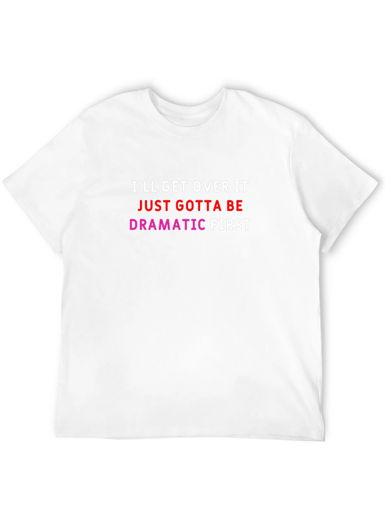 Express your personality with this eye-catching black t-shirt. Made from comfortable, breathable fabric, this tee features the fun slogan "I'll Get Over It Just Gotta Be Dramatic First." The vibrant text, a mix of white, red, and pink, stands out against the black background, making it a perfect statement piece. Ideal for casual wear, parties, or as a unique gift, this t-shirt adds a touch of humor to your wardrobe. Show off your sassy side and grab yours today!
