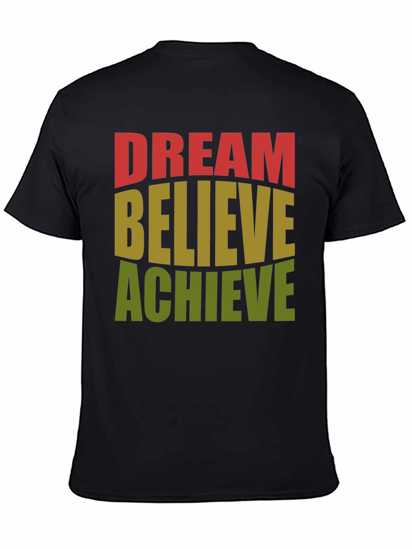 Inspire yourself and others with this motivational graphic t-shirt. Featuring the words "DREAM", "BELIEVE", and "ACHIEVE" in stacked, bold lettering, this tee is a statement piece. The top word is red, the middle word is gold, and the bottom word is green. Made from a comfortable-looking black fabric, this casual wear is perfect for everyday wear. Ideal for workouts, casual outings, or just lounging around, this t-shirt will keep you feeling positive and stylish. Grab yours today and start chasing your dreams!