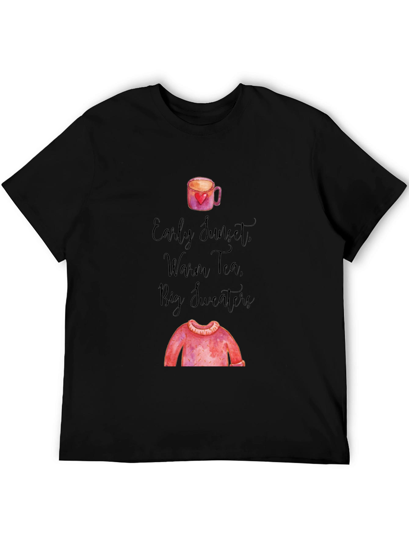 Embrace cozy vibes with this charming black t-shirt featuring a delightful design. The graphic showcases a whimsical illustration of a steaming mug adorned with a heart, accompanied by the handwritten text 'Early Sunset, Warm Tea, Big Sweaters'. Below, a cute sweater graphic enhances the design's theme. Made from comfortable fabric, this tee is perfect for relaxing weekends, casual outings, or adding a touch of warmth to your everyday wardrobe. Its relaxed fit and soft material make it an ideal choice for all-day wear. Show off your love for cozy season with this unique and stylish t-shirt. A great conversation starter!