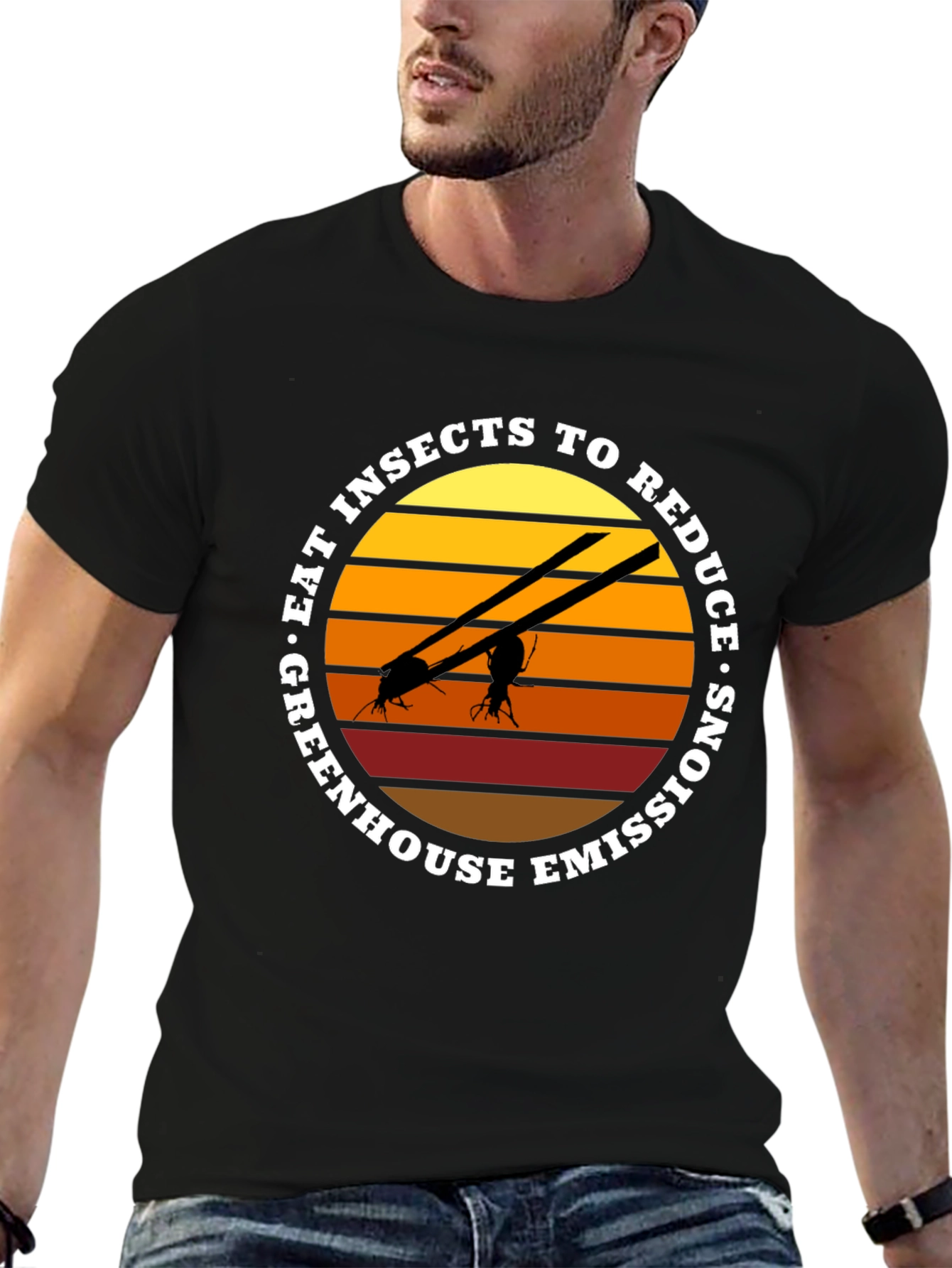 Show your support for sustainable food sources with this unique t-shirt! Featuring a bold graphic design of insects between chopsticks set against a retro sunset backdrop. The text "Eat Insects to Reduce Greenhouse Emissions" circles the image. This tee is sure to spark conversations and promote eco-consciousness. Made from comfortable material, it's perfect for everyday wear, environmental events, or as a thoughtful gift for eco-warriors.