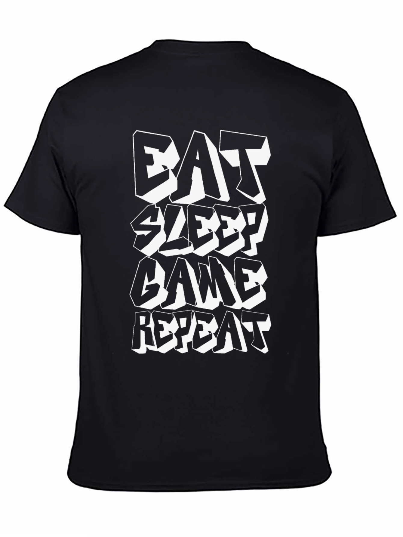 Show off your gamer lifestyle with this black graphic tee! Featuring a bold, stacked "Eat Sleep Game Repeat" design in a distinctive white blocky font, this shirt is perfect for everyday wear. The cotton blend material provides a soft, comfortable fit. Ideal for casual outings, gaming sessions, or relaxing at home, this tee effortlessly combines comfort and style. Grab yours now and express your passion for gaming!
